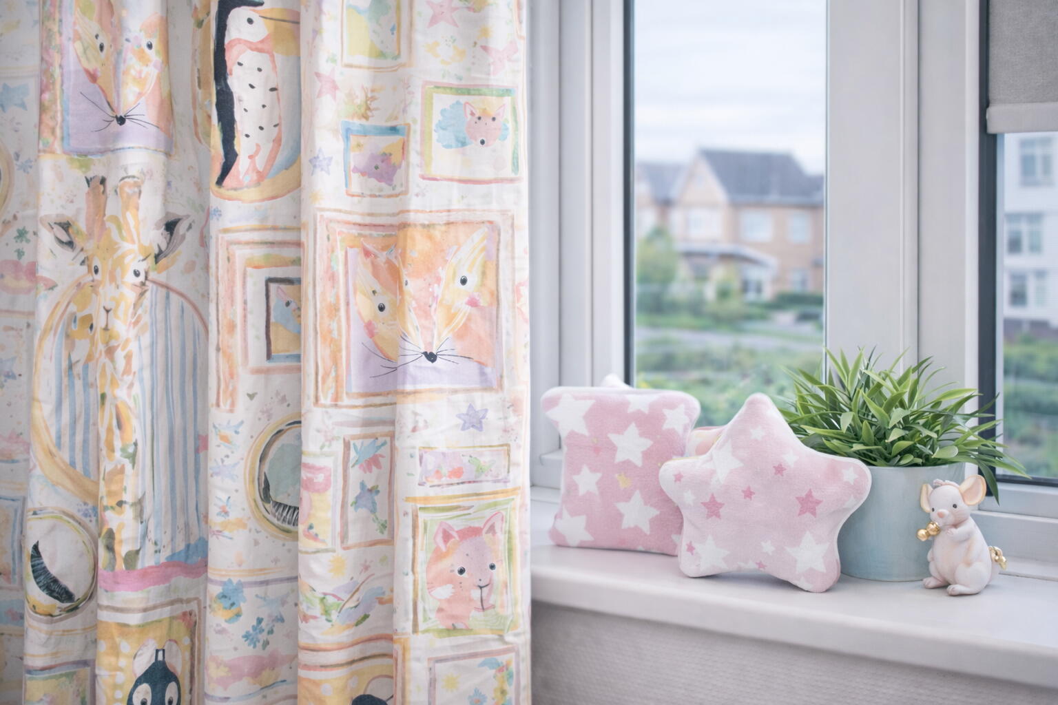 In het motief komen onder andere een pinguïn met strik, een nieuwsgierige giraf, een beer met bril, een vos, een vogel en andere dierenvriendjes terug. De lijsten verschillen subtiel van vorm en formaat – ovaal, rechthoekig of speels afgerond – wat zorgt voor een levendig en afwisselend beeld. Sommige kaders zijn royaal opgezet: zo meet de beer bijvoorbeeld circa 18 x 18 cm, waardoor de dieren goed zichtbaar blijven, ook wanneer het gordijn geplooid hangt.