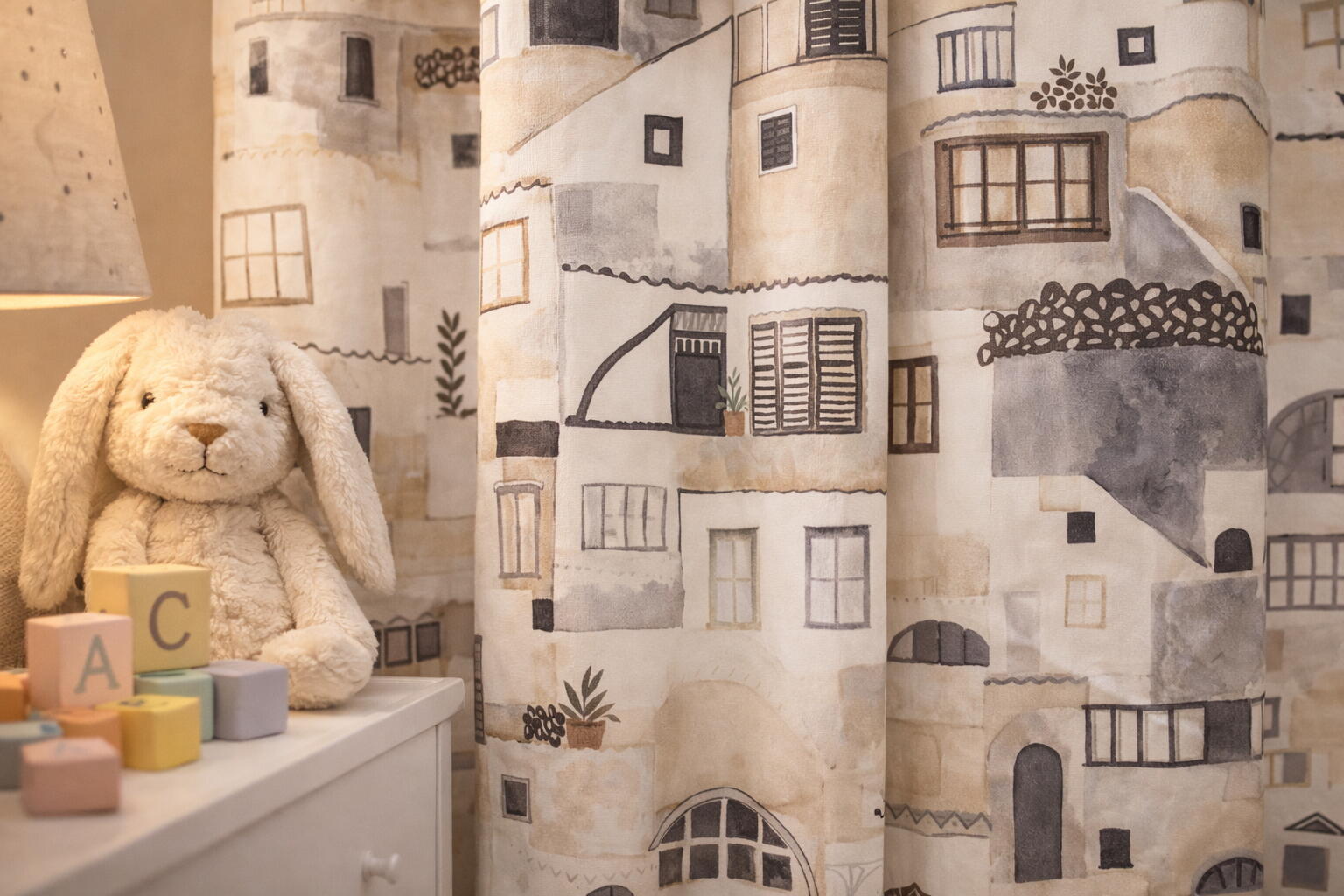 Dit kindergordijn brengt het stedelijke aanzicht van een charmante Zuid-Europese stad tot leven, waardoor een speels en avontuurlijk gevoel ontstaat in de kinderkamer. Laat de kinderen wegdromen terwijl ze omringd worden door de magie en het karakter van deze prachtige stijl.