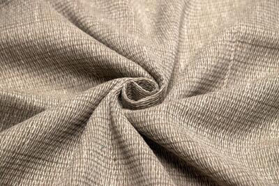 Gandi is een kamerhoog gordijn met een verfijnde, grafische weefstructuur die direct zichtbaar is in de stof zelf – geen print, maar een patroon dat ontstaat door het weven. In de stof is een regelmatig herhaald motief te zien van smalle, verticale V-vormige schakeringen die samen een rustig ritme vormen over het gehele oppervlak. Dit patroon is subtiel, maar duidelijk aanwezig en geeft het doek een mooie dieptewerking zodra het licht erop valt. De structuur is één van de sterke punten van Gandi. Het doek is opgebouwd uit fijne, strak geweven draden die samen een gelijkmatig raster vormen. Daaroverheen lopen iets dikkere inslagdraden die het V-patroon creëren. Hierdoor ontstaat een licht reliëf en een zachte schaduwwerking in het oppervlak. De stof voelt textielachtig en stevig aan, maar blijft tegelijk lichtdoorlatend en soepel in de plooi. Wanneer daglicht door het gordijn valt, wordt het licht zacht gefilterd. Het patroon blijft zichtbaar, wat de ruimte een gelaagde uitstraling geeft zonder het zicht volledig te blokkeren. Daardoor is Gandi zeer geschikt voor woonkamers, eetkamers en grote raampartijen waar een goede balans tussen privacy en licht gewenst is. Doordat de stof kamerhoog wordt geleverd, loopt het gordijn uit één stuk van plafond tot vloer. In combinatie met bijvoorbeeld een vlinder, of een rustige wave-plooi komt het verticale patroon extra goed tot zijn recht en wordt de hoogtewerking van de ruimte versterkt. Gandi is verkrijgbaar in zes zorgvuldig gekozen tinten, elk met een eigen karakter: