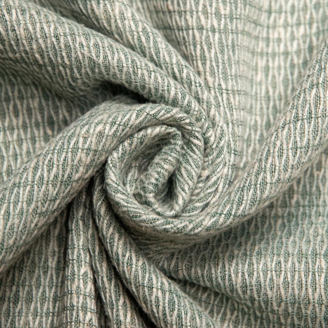 Gandi is een kamerhoog gordijn met een verfijnde, grafische weefstructuur die direct zichtbaar is in de stof zelf – geen print, maar een patroon dat ontstaat door het weven. In de stof is een regelmatig herhaald motief te zien van smalle, verticale V-vormige schakeringen die samen een rustig ritme vormen over het gehele oppervlak. Dit patroon is subtiel, maar duidelijk aanwezig en geeft het doek een mooie dieptewerking zodra het licht erop valt. De structuur is één van de sterke punten van Gandi. Het doek is opgebouwd uit fijne, strak geweven draden die samen een gelijkmatig raster vormen. Daaroverheen lopen iets dikkere inslagdraden die het V-patroon creëren. Hierdoor ontstaat een licht reliëf en een zachte schaduwwerking in het oppervlak. De stof voelt textielachtig en stevig aan, maar blijft tegelijk lichtdoorlatend en soepel in de plooi. Wanneer daglicht door het gordijn valt, wordt het licht zacht gefilterd. Het patroon blijft zichtbaar, wat de ruimte een gelaagde uitstraling geeft zonder het zicht volledig te blokkeren. Daardoor is Gandi zeer geschikt voor woonkamers, eetkamers en grote raampartijen waar een goede balans tussen privacy en licht gewenst is. Doordat de stof kamerhoog wordt geleverd, loopt het gordijn uit één stuk van plafond tot vloer. In combinatie met bijvoorbeeld een vlinder, of een rustige wave-plooi komt het verticale patroon extra goed tot zijn recht en wordt de hoogtewerking van de ruimte versterkt. Gandi is verkrijgbaar in zes zorgvuldig gekozen tinten, elk met een eigen karakter: