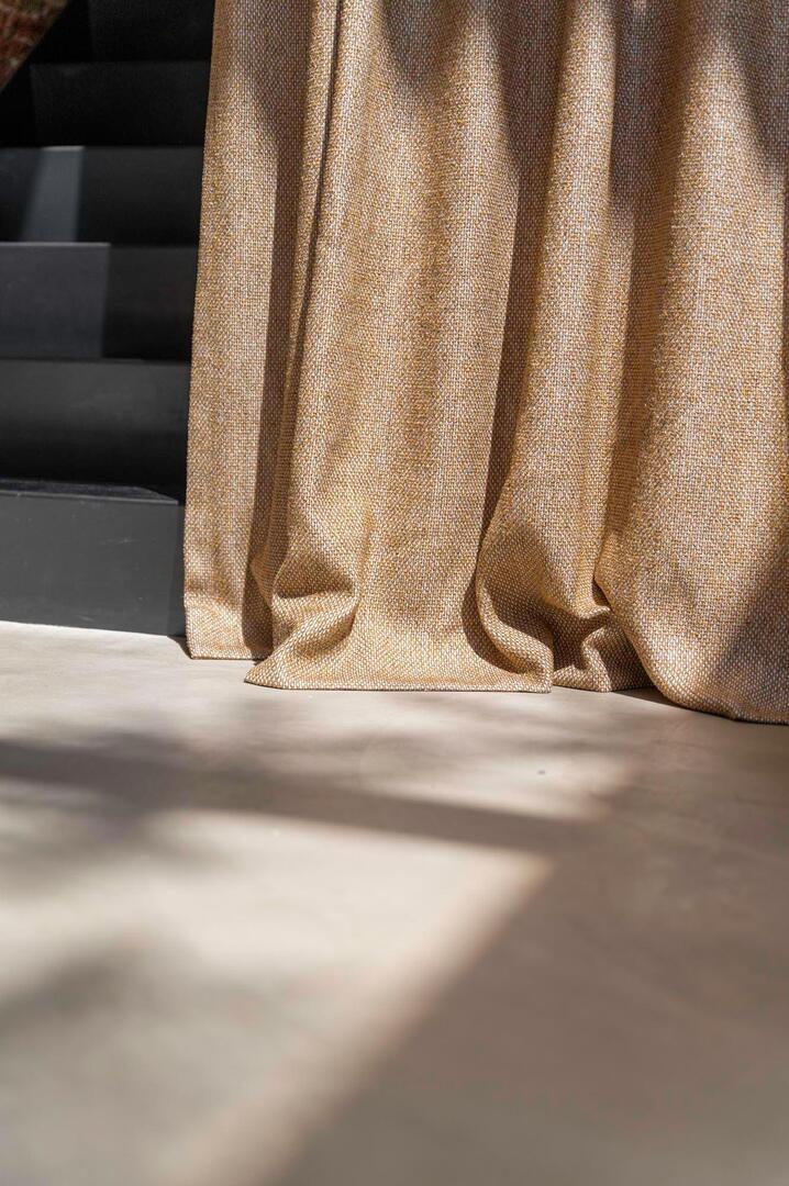 Change is een gordijn dat direct opvalt door zijn rijke materiaaluitdrukking en subtiele, maar duidelijke structuur. Het gordijn Change heeft zachte schakeringen die variëren van licht beige tot een wat donkerdere taupe-achtige nuance. Deze variatie ontstaat door de manier waarop de draden in het weefsel zijn opgebouwd, waardoor de stof diepte en een levendig oppervlak krijgt. Het motief toont een fijn korrelig weefpatroon dat bestaat uit kleine, gelijkmatige lusjes en schakeringen die samen een rustige, maar interessante structuur vormen. Wanneer het gordijn in plooien valt — zoals op de afbeelding te zien is — ontstaat er een speels samenspel van licht en schaduw. De plooien versterken de natuurlijke schakeringen en geven het geheel een krachtige, warme uitstraling die goed past in zowel moderne als wereldse interieurs. Het karakter van Change: de etnische inslag en de manier waarop de kettingdraad is samengesteld uit verschillende kleurtonen geeft de stof diepte en een gelaagd uiterlijk. Dit zorgt ervoor dat Change niet vlak oogt, maar een subtiel patroon toont dat bij elke lichtval net iets anders naar voren komt. Change is bovendien ideaal voor wie houdt van gordijnen die royaal over de vloer vallen. De soepele stof laat zich moeiteloos in lange, vloeiende plooien leggen — zoals duidelijk zichtbaar op de foto. Voor dit effect wordt aangeraden om 10 tot 15 cm extra lengte te bestellen. Wil je eerst ervaren hoe Change aanvoelt en hoe de kleur in jouw eigen woonruimte uitkomt? Je kunt eenvoudig een knipstaal aanvragen om de structuur en tint thuis te beoordelen. Meestal wordt het staaltje dezelfde dag nog verstuurd.