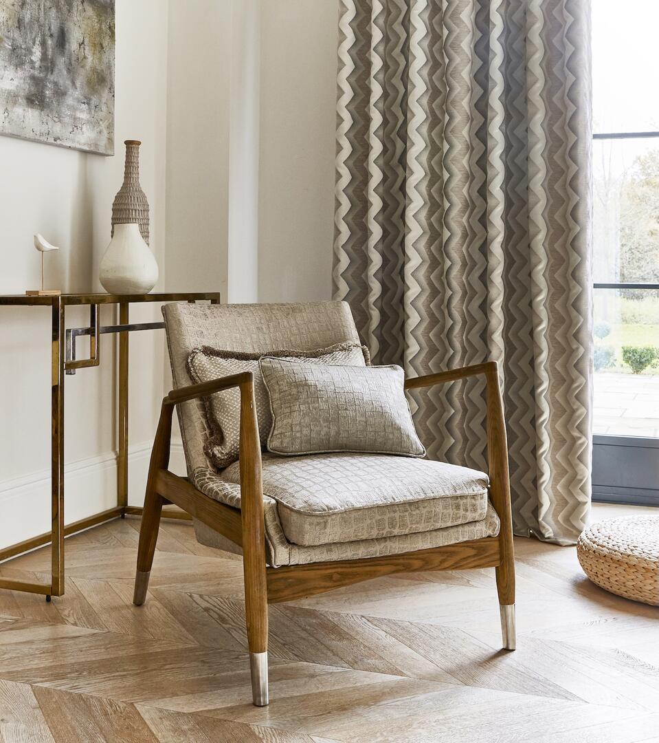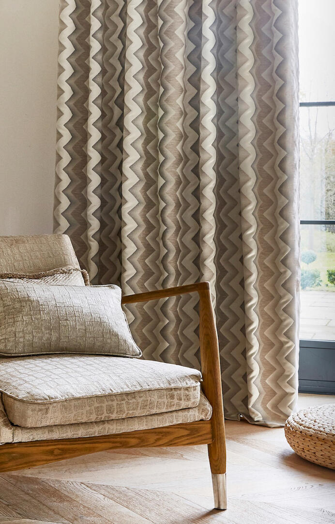 De Constancia is een bijzonder jacquard geweven dubbellaag gordijnstof. De stof bestaat uit twee lagen die op een unieke wijze met elkaar verweven zijn, waardoor een opvallend effect ontstaat doordat de bovenste laag gedeeltelijk losligt van de ondergrond. Het zigzagmotief wordt met drie verschillende weeftechnieken vervaardigd: double layer, semi double layer en enkel layer. Dit samenspel zorgt voor een betoverend visueel resultaat dat niet snel verveeld. Voor extra isolatie en verduistering is er de optie om tijdens het bestellen een voering toe te voegen.