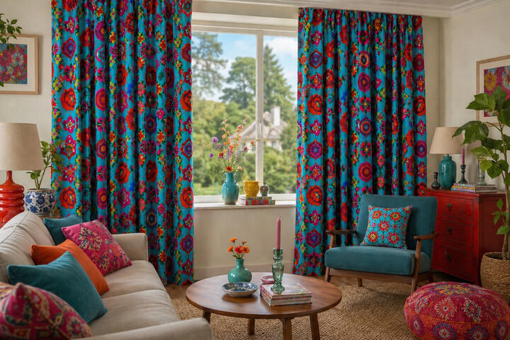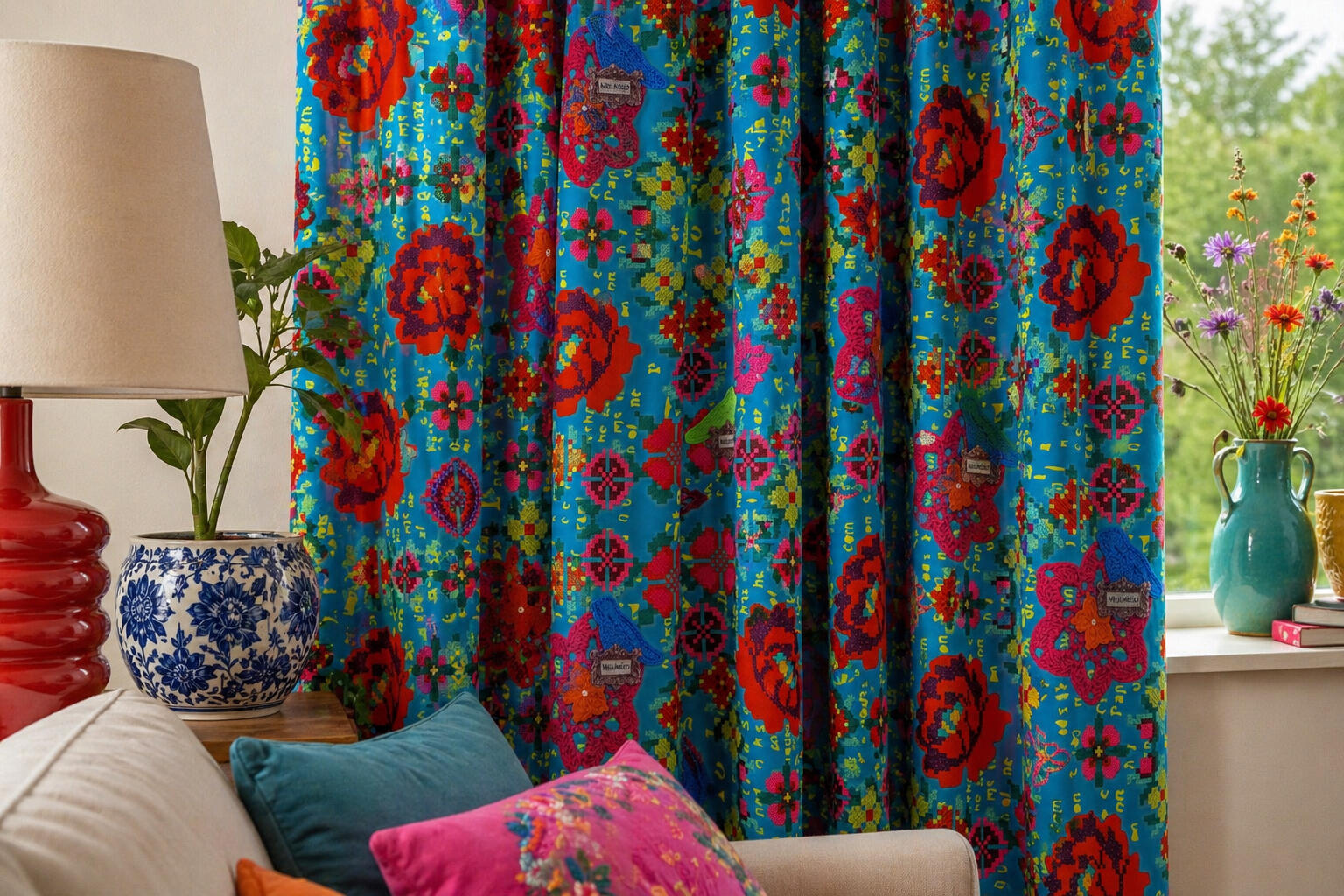 De structuur van de print wekt de indruk van handwerk, met subtiele variaties die lijken op gehaakte en geborduurde details. Hierdoor krijgt het gordijn een ambachtelijk karakter dat goed past in zowel een kleurrijk interieur als een ruimte waar één uitgesproken element de aandacht mag trekken.