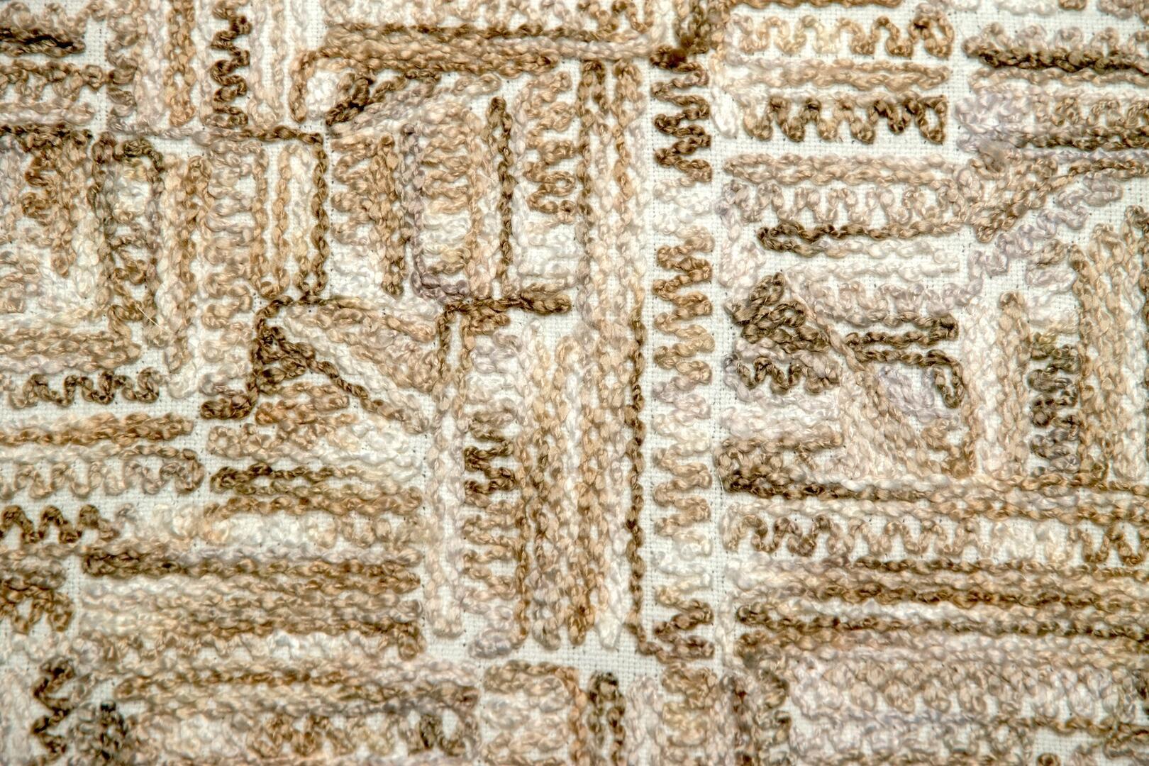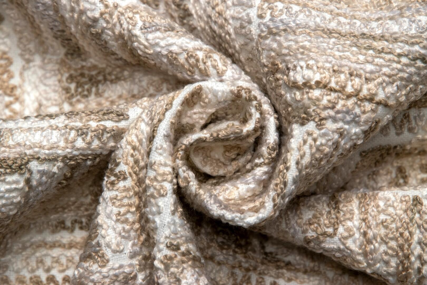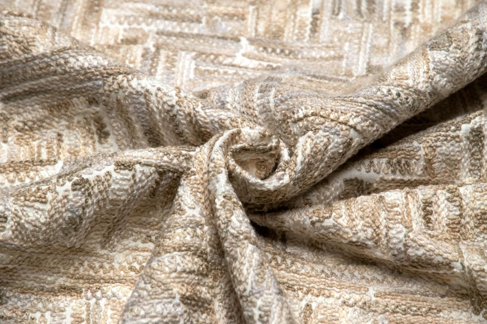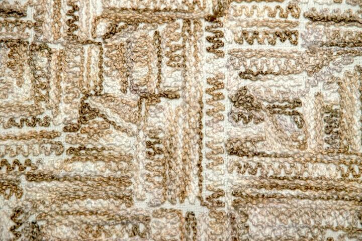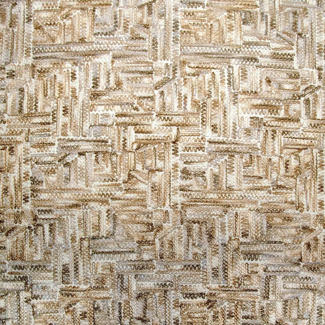 Wat deze stof zo onderscheidt, is de manier waarop het motief tot stand komt. De draden zijn niet simpelweg gedrukt of bedrukt, maar nauwgezet in het weefsel geïntegreerd. Dit levert een voelbaar reliëf op, waarin lichte en schaduwpartijen ontstaan naarmate het licht over het oppervlak strijkt. Het patroon toont een onregelmatige geometrische structuur: een combinatie van rechte lijnen en subtiel gebogen segmenten die ritme geven aan het geheel. Het lijkt alsof het weefsel zelf een grafische sculptuur is, die bij elk standpunt een andere indruk maakt.
