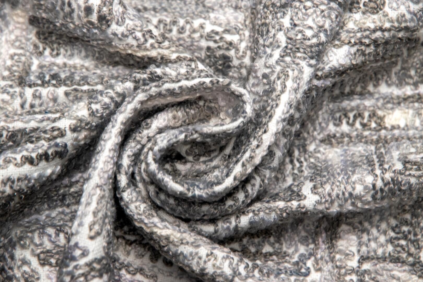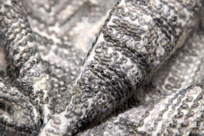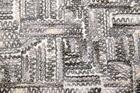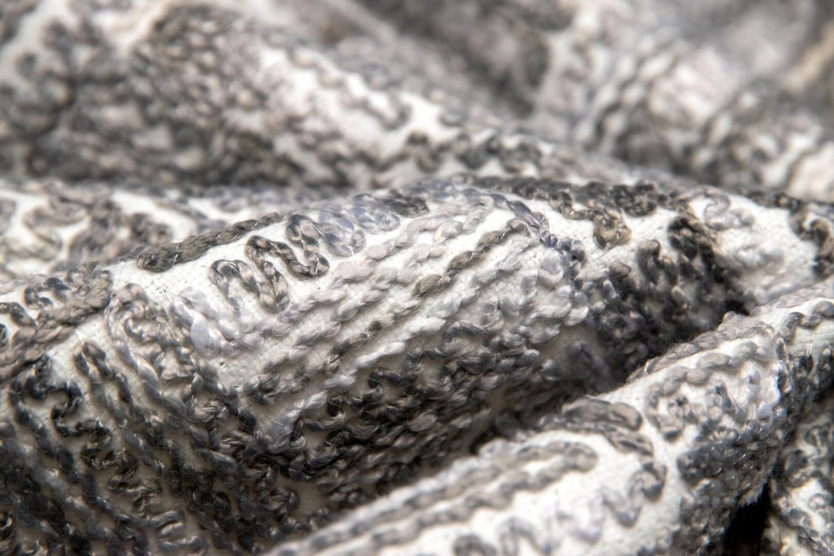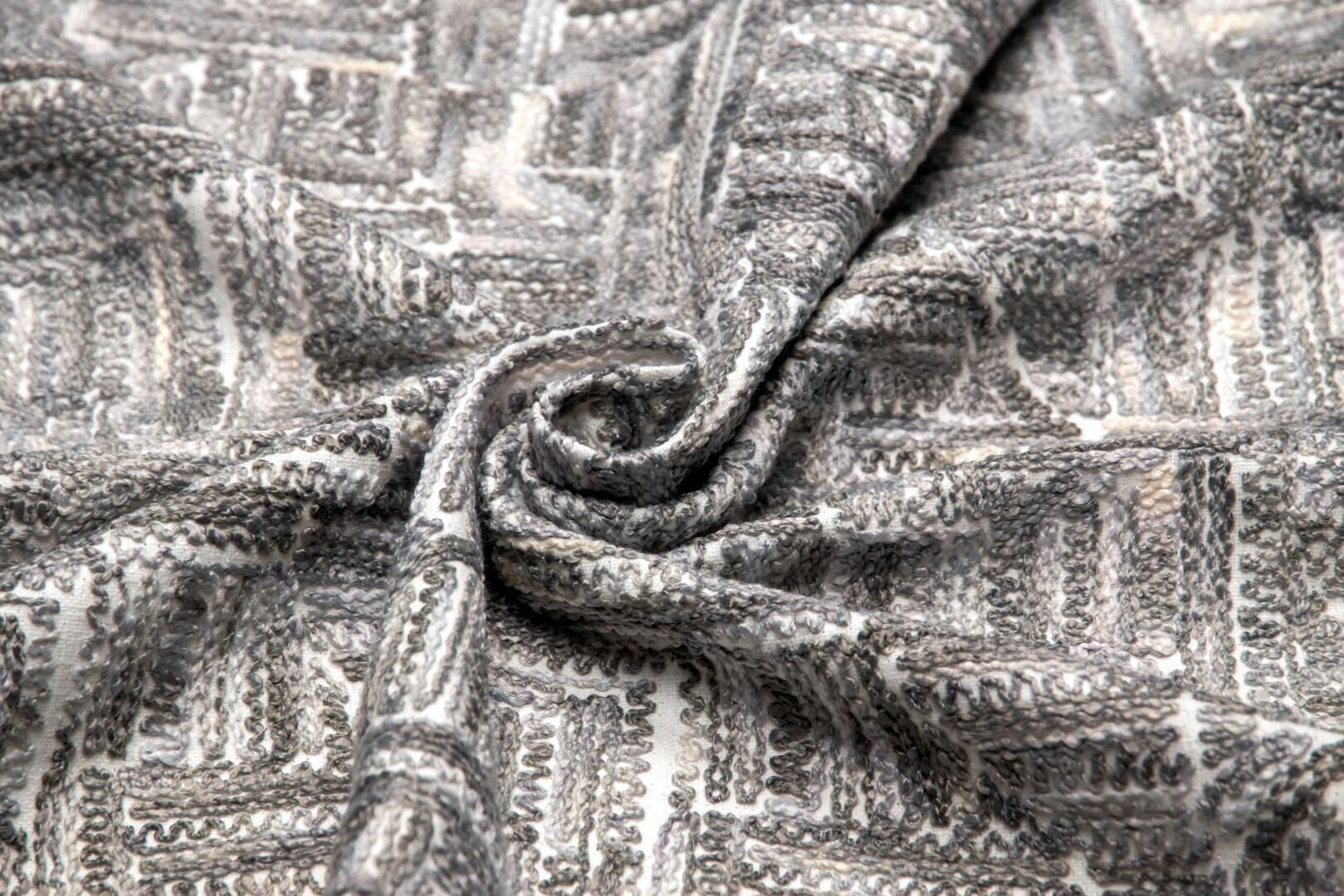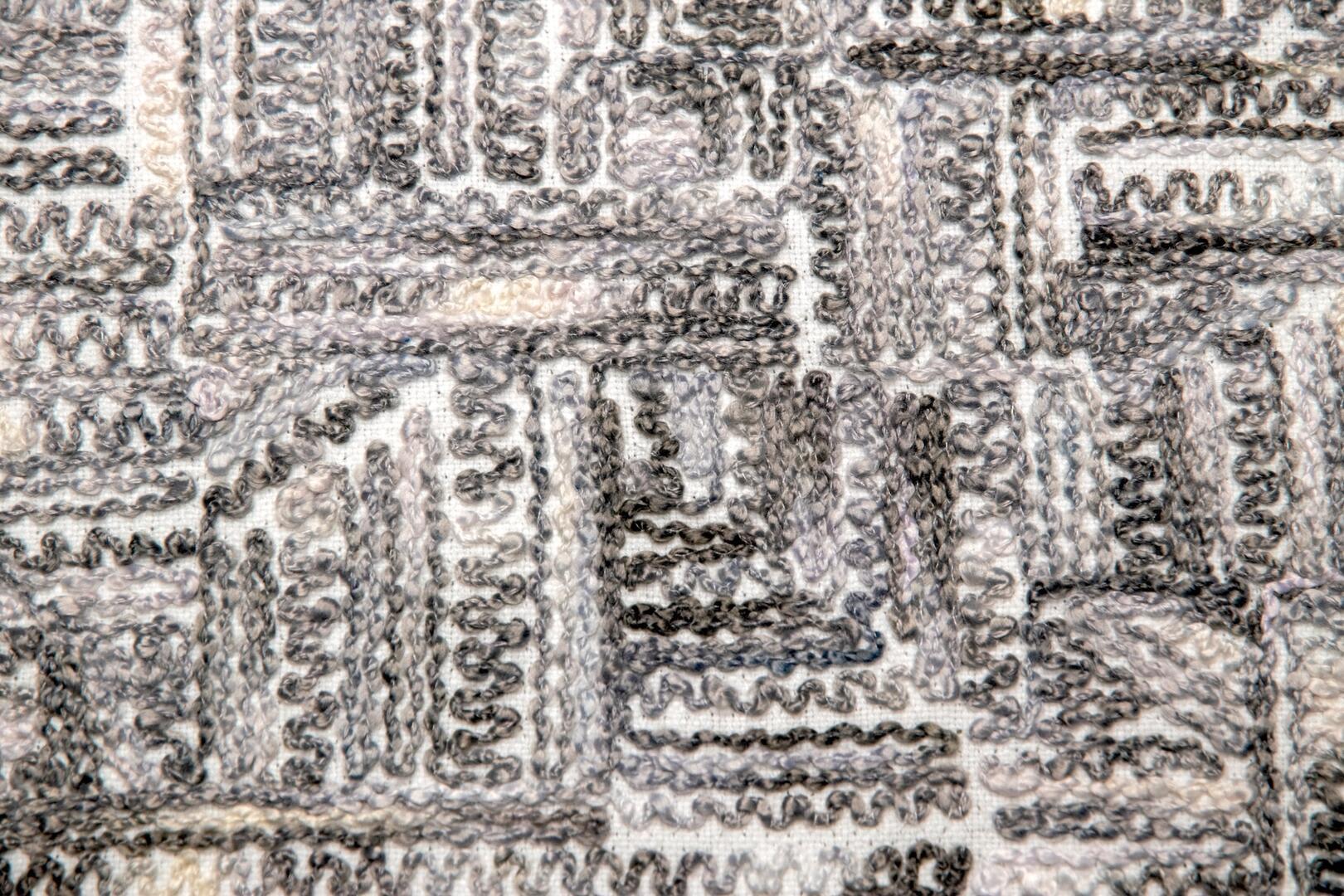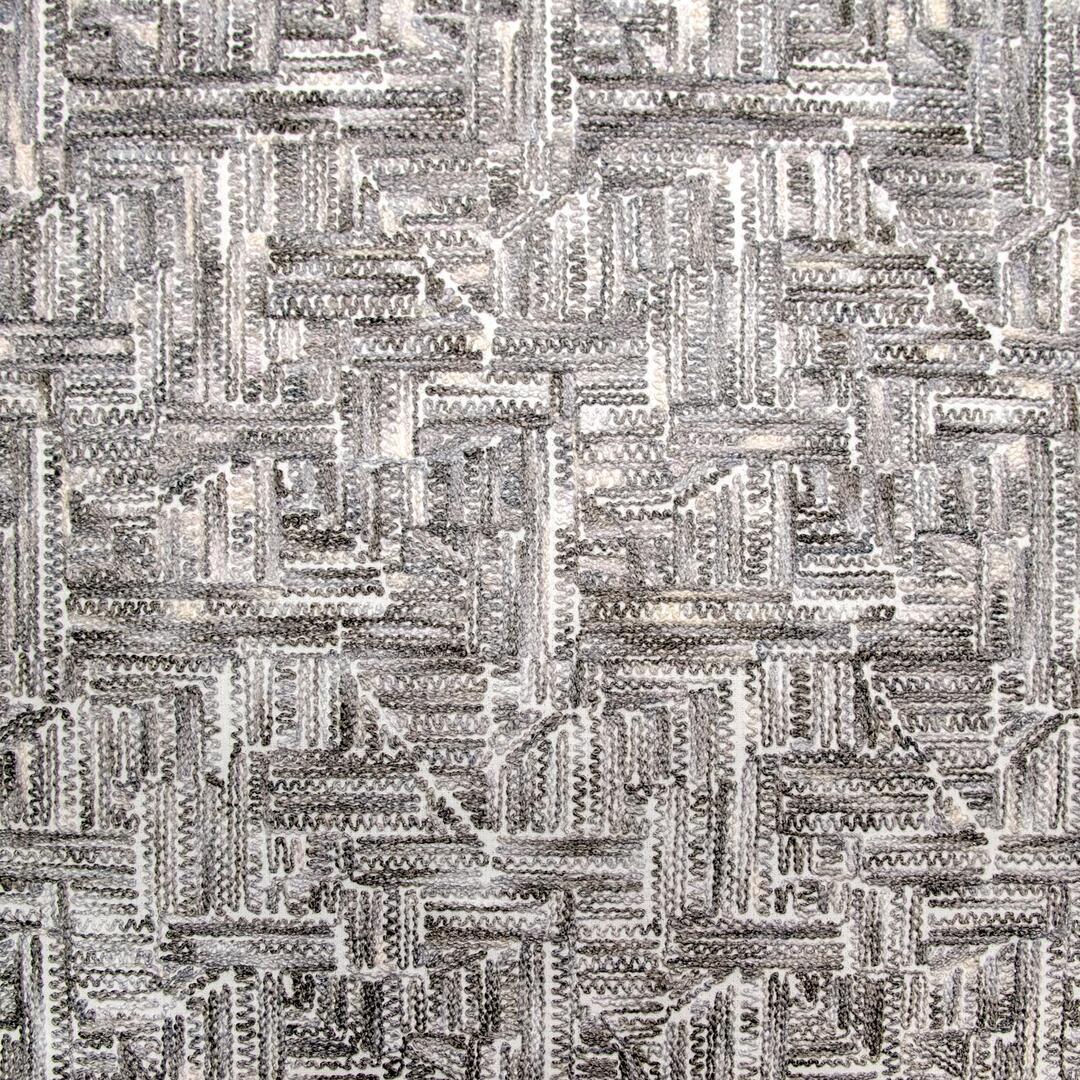 Wat deze stof zo onderscheidt, is de manier waarop het motief tot stand komt. De draden zijn niet simpelweg gedrukt of bedrukt, maar nauwgezet in het weefsel geïntegreerd. Dit levert een voelbaar reliëf op, waarin lichte en schaduwpartijen ontstaan naarmate het licht over het oppervlak strijkt. Het patroon toont een onregelmatige geometrische structuur: een combinatie van rechte lijnen en subtiel gebogen segmenten die ritme geven aan het geheel. Het lijkt alsof het weefsel zelf een grafische sculptuur is, die bij elk standpunt een andere indruk maakt.