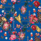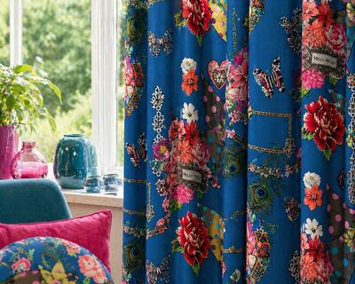 Floral Fantasy is een uitgesproken en levendig gordijn dat direct de aandacht trekt door het rijke, gedetailleerde dessin. De basis bestaat uit een diepe, verzadigde blauwtint die zorgt voor een krachtig fundament in de ruimte. Hieroverheen ligt een speels en gelaagd patroon van bloemen, vlinders en sierlijke ornamenten. Grote bloemmotieven in tinten roze, rood, koraal en zacht wit wisselen elkaar af en worden aangevuld met fijne details zoals pauwenveren, hartvormen en decoratieve kaders met subtiele goudaccenten.