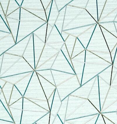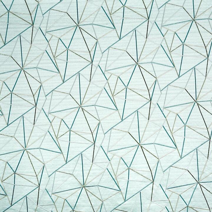 Dit bijzondere overgordijn kenmerkt zich door een verfijnd patroon van geometrische lijnen, geborduurd met diverse garens, waaronder glanzende en matte tinten, afgestemd op kleur. Het productieproces is intensief en tijdrovend, doordat de draden van het patroon met tal van naalden wordt ingestikt blijft deze stof geheel exclusief en uniek.