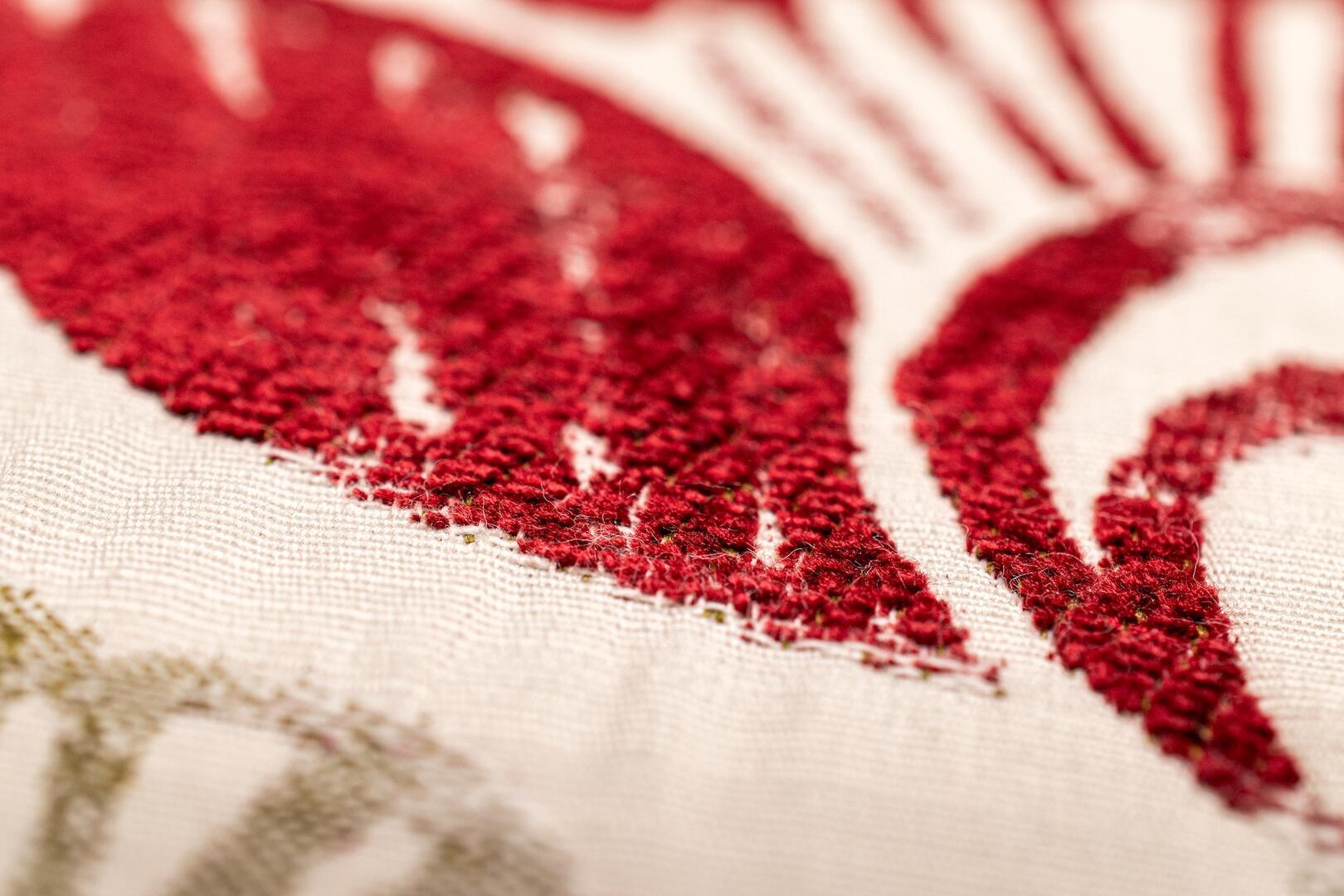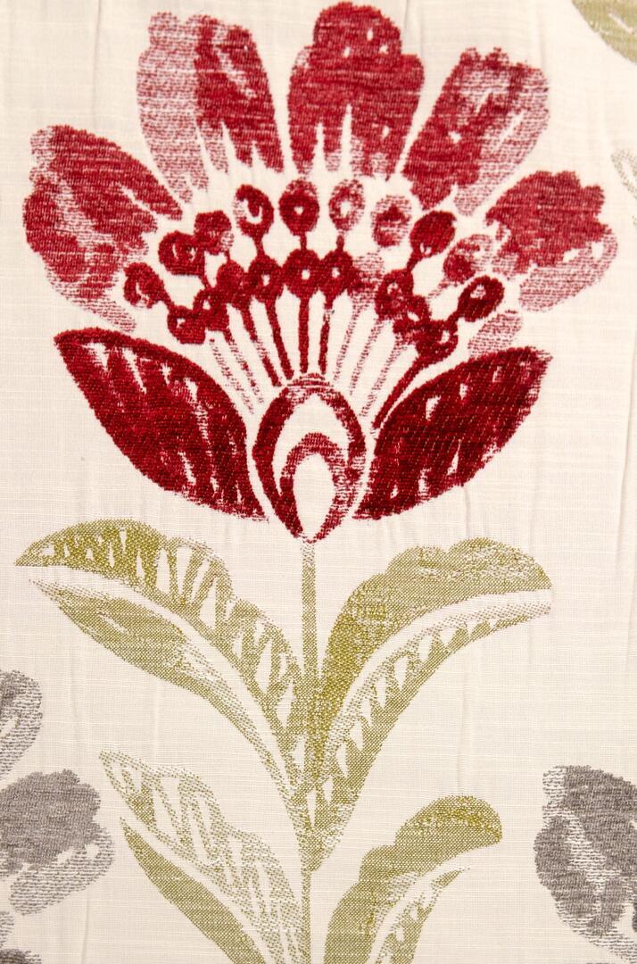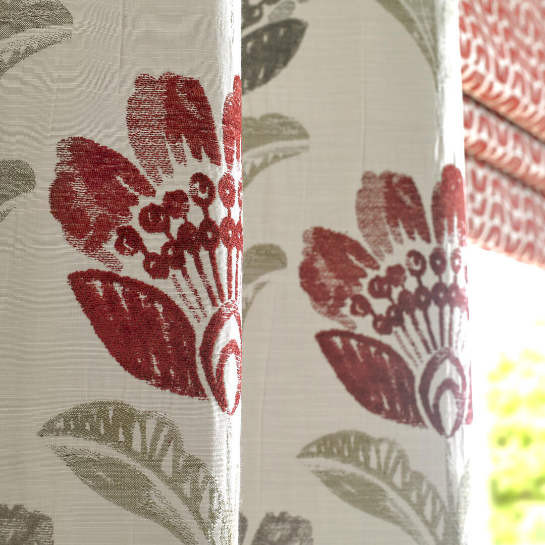 De bloemen zijn uitgevoerd in een diepe bordeauxrode tint met subtiele schakeringen in het velours, wat zorgt voor extra diepte. De bladeren variëren tussen grijsgroen en olijfgroen en steken zacht af tegen de naturel linnenkleurige ondergrond. Deze combinatie van warm rood en natuurlijke groentonen geeft de stof een volle, warme uitstraling zonder hard contrast. Bordeaux is een super dikke, dubbel geweven gordijnstof met een bijzondere constructie.