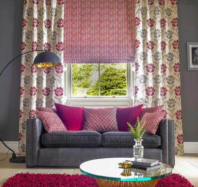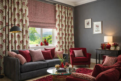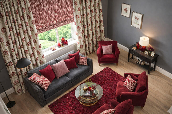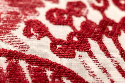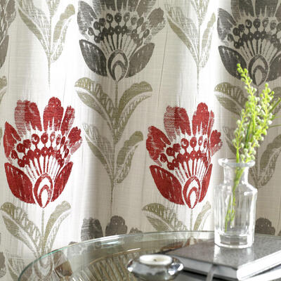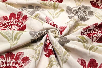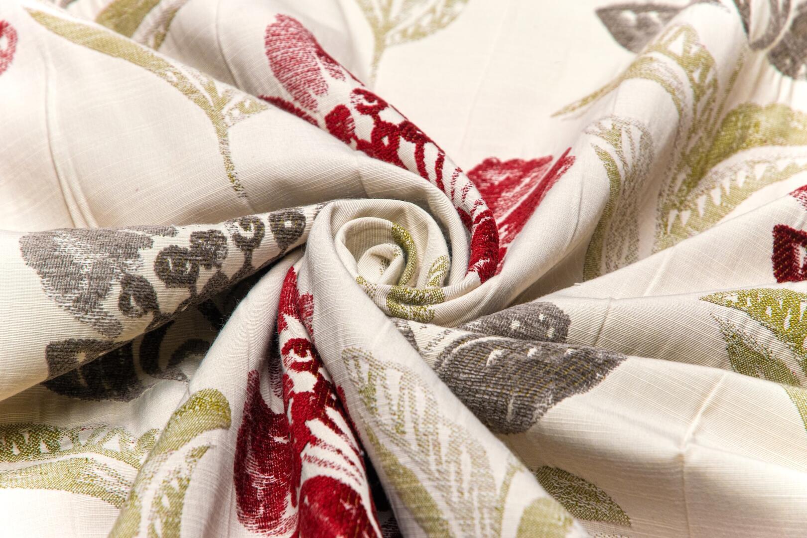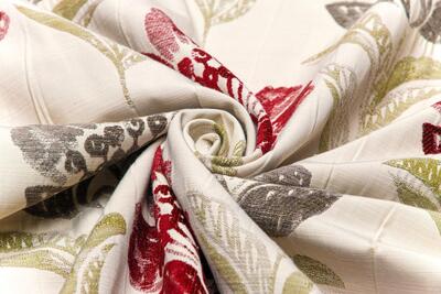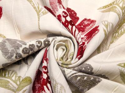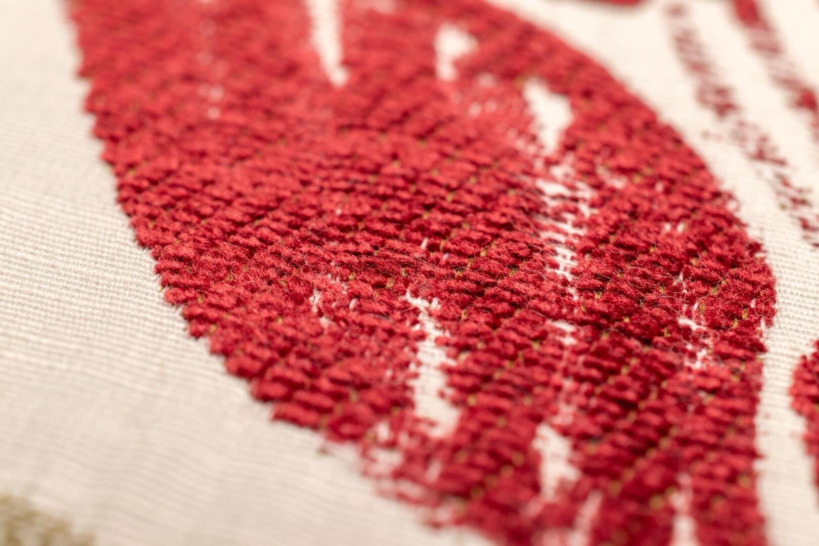 De bloemen zijn uitgevoerd in een diepe bordeauxrode tint met subtiele schakeringen in het velours, wat zorgt voor extra diepte. De bladeren variëren tussen grijsgroen en olijfgroen en steken zacht af tegen de naturel linnenkleurige ondergrond. Deze combinatie van warm rood en natuurlijke groentonen geeft de stof een volle, warme uitstraling zonder hard contrast. Bordeaux is een super dikke, dubbel geweven gordijnstof met een bijzondere constructie.
