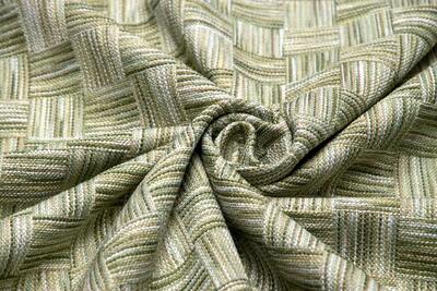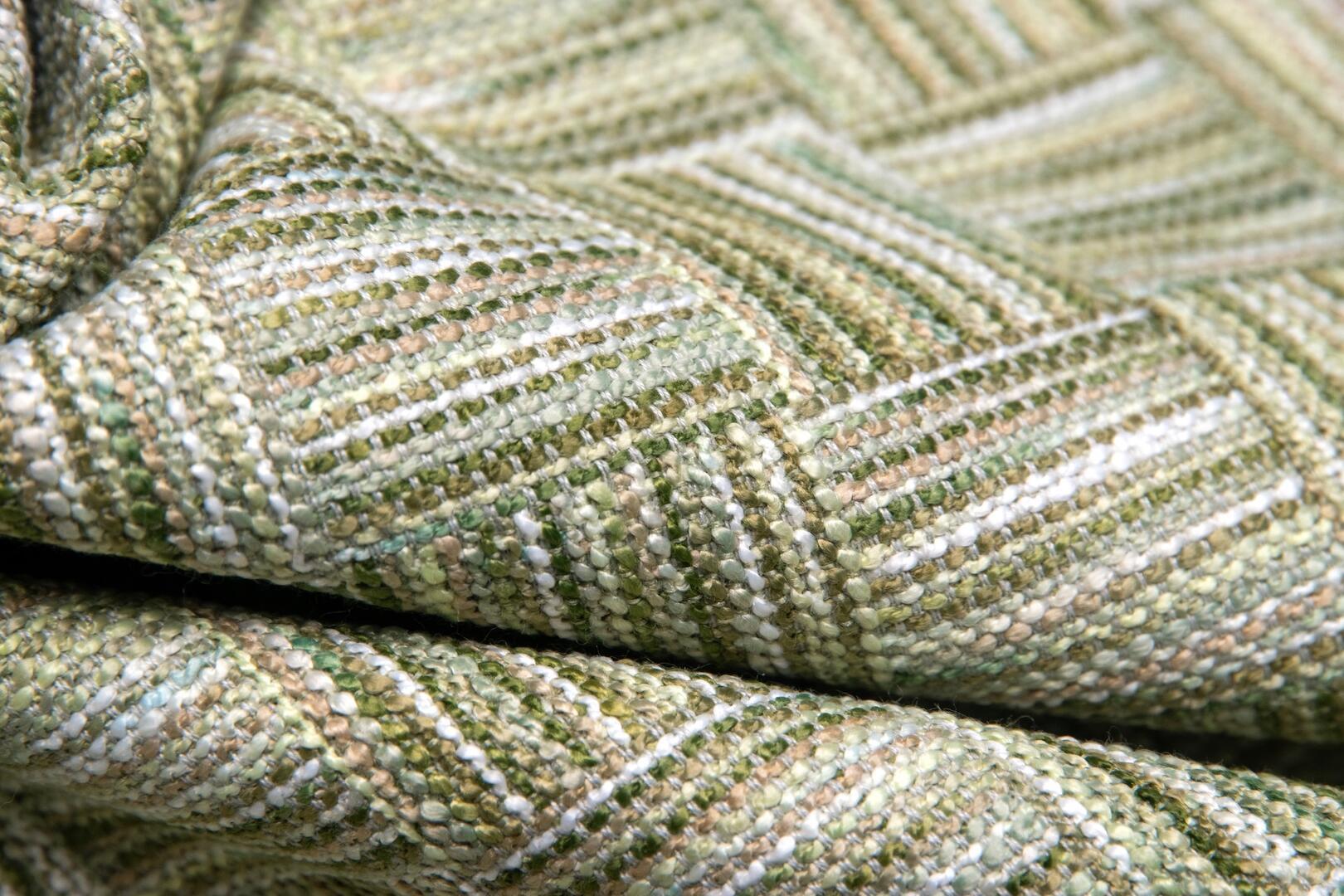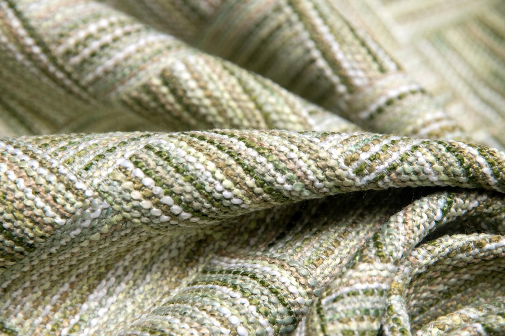 De stof heeft een matte afwerking waarbij het reliëf goed tot zijn recht komt. Van dichtbij zijn de verschillende garendiktes en kleurnuances duidelijk zichtbaar, terwijl het patroon van een afstand juist samenkomt tot een rustig geheel.