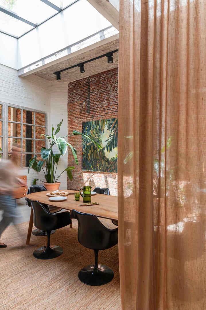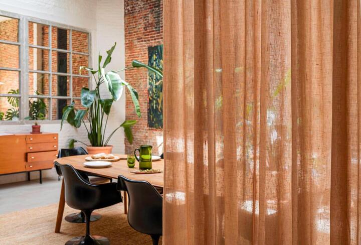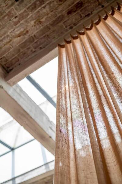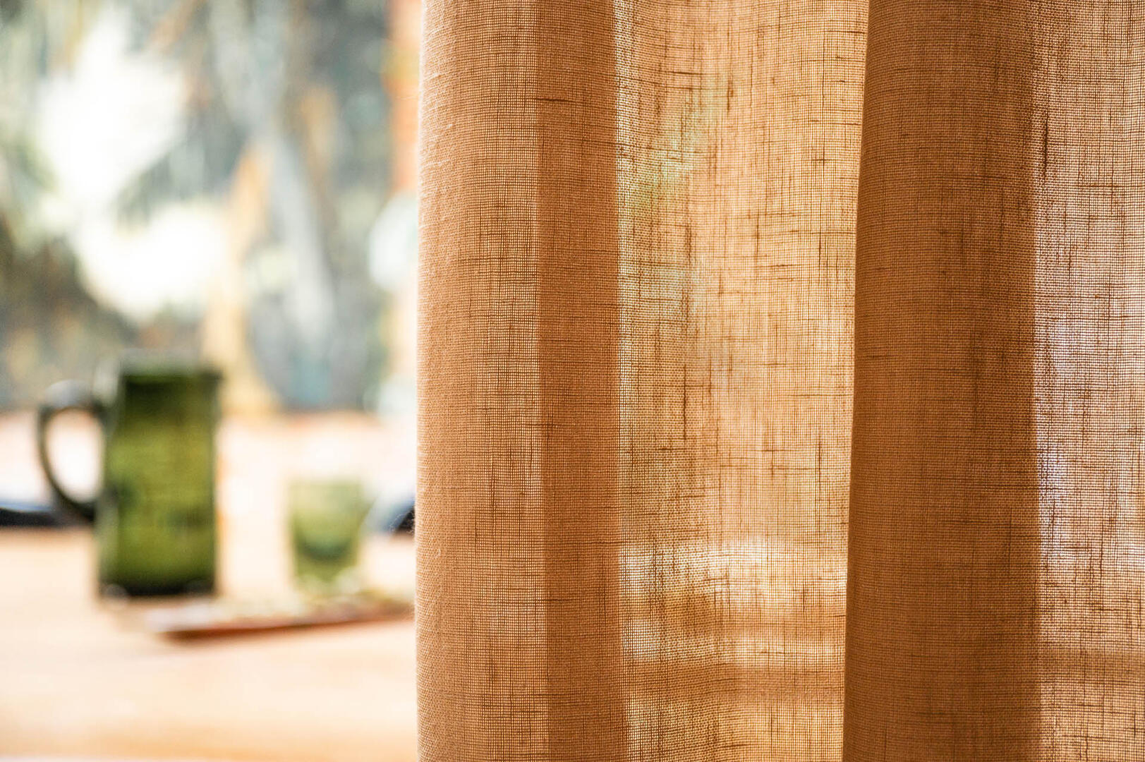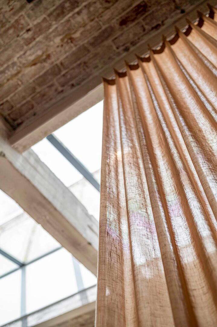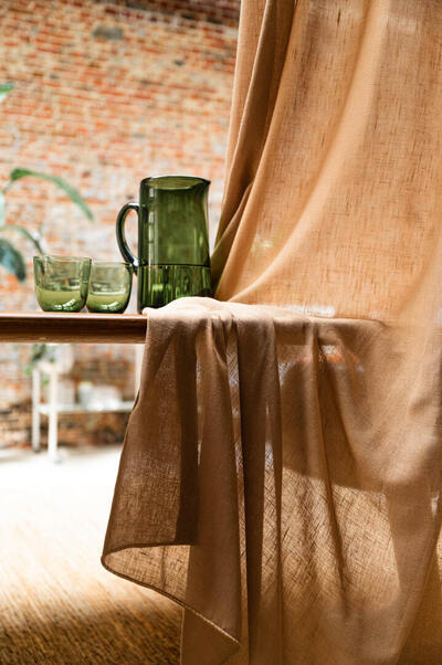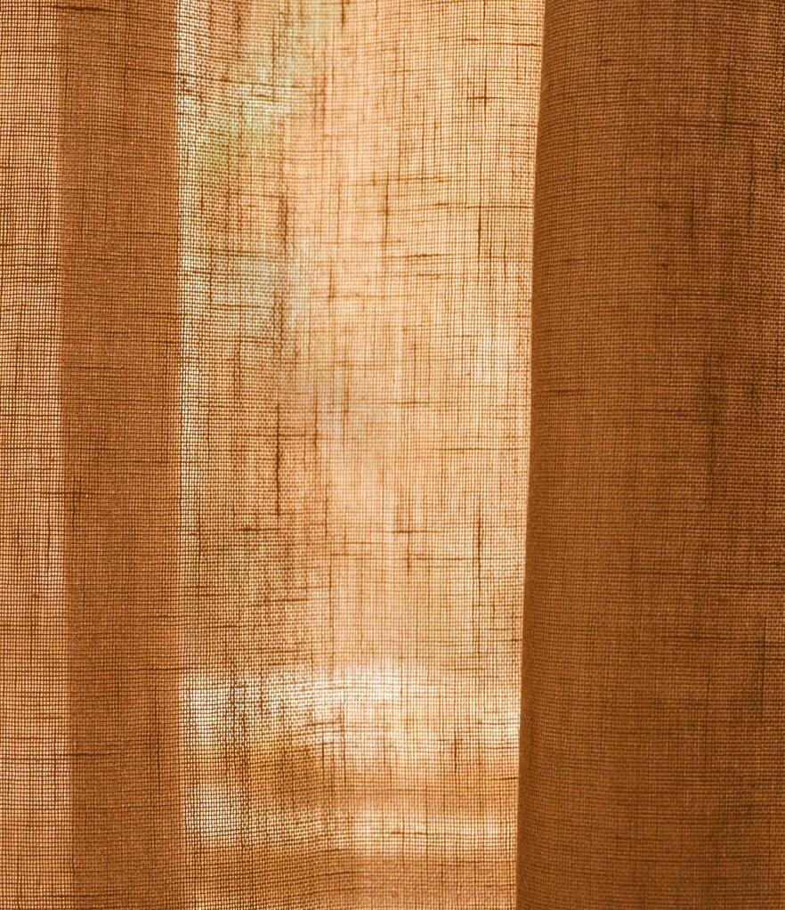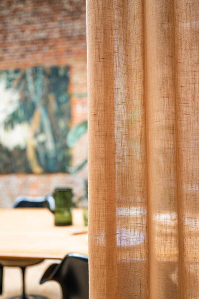 Immersion is een sfeervol in-between gordijn dat opvalt door zijn natuurlijke en rustige uitstraling. De stof valt soepel en laat het daglicht op een subtiele manier door. Hierdoor ontstaat een zachte lichtfiltering die een fijne balans geeft tussen privacy en openheid. Op de afbeelding is te zien hoe de stof een fijn geweven structuur heeft met lichte en donkere nuances die prachtig in elkaar overlopen. De kleur toont zich als een warme, lichte bruintint met een zacht beige ondertoon. Door het doorvallende licht worden er subtiele variaties zichtbaar: hier en daar zie je bijna goudachtige schakeringen, terwijl andere delen juist wat koeler beige ogen. Dit levendige spel ontstaat doordat het licht door de vezels heen wordt gefilterd en zo voor diepte in de stof zorgt. Het motief zelf is rustig en bestaat uit een verticale, licht onregelmatige weving die de stof een natuurlijke uitstraling geeft zonder druk te worden. Flow, de stof waarop Immersion gebaseerd is, voelt zacht aan en valt soepel. De lichte structuur zorgt ervoor dat het gordijn prettig aanvoelt en vriendelijk oogt in vrijwel iedere woonstijl. Dankzij het brede kleurenpalet is er altijd een variant die aansluit bij jouw interieur.