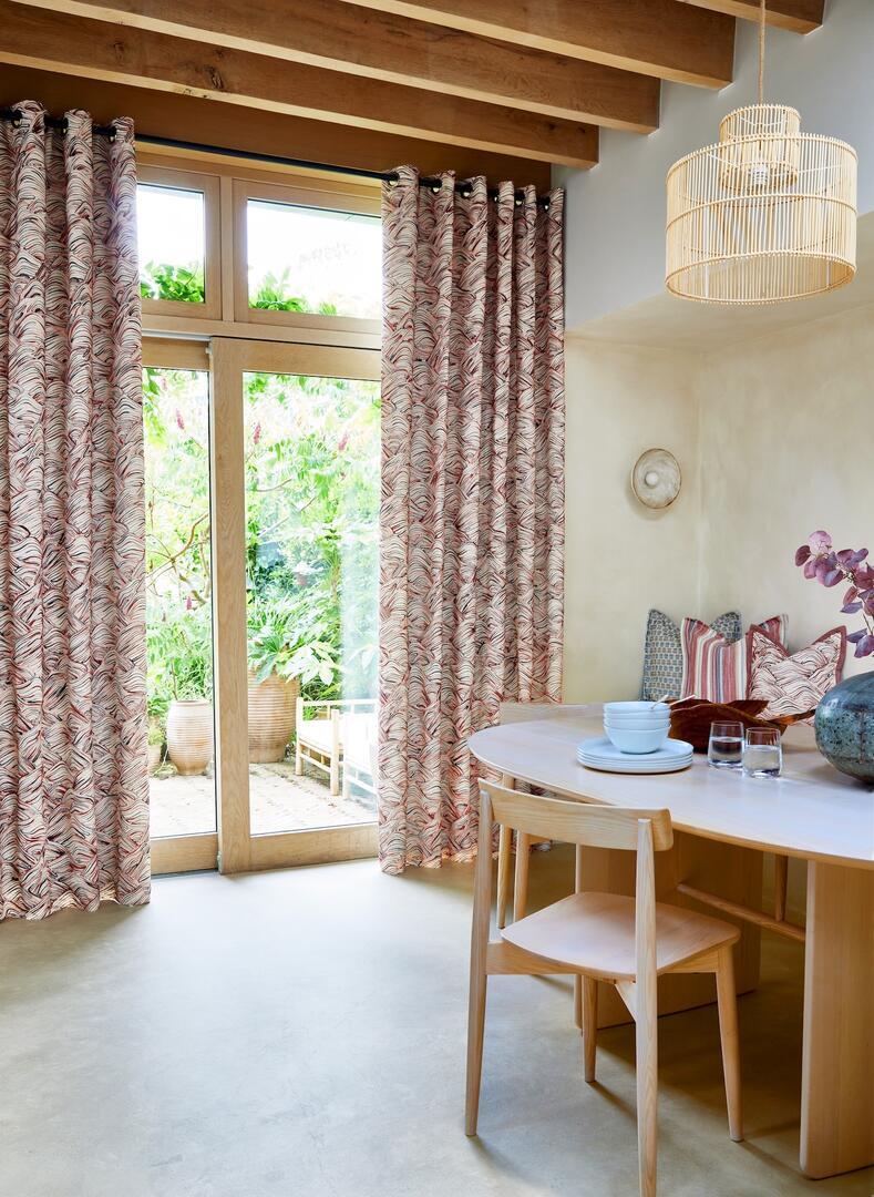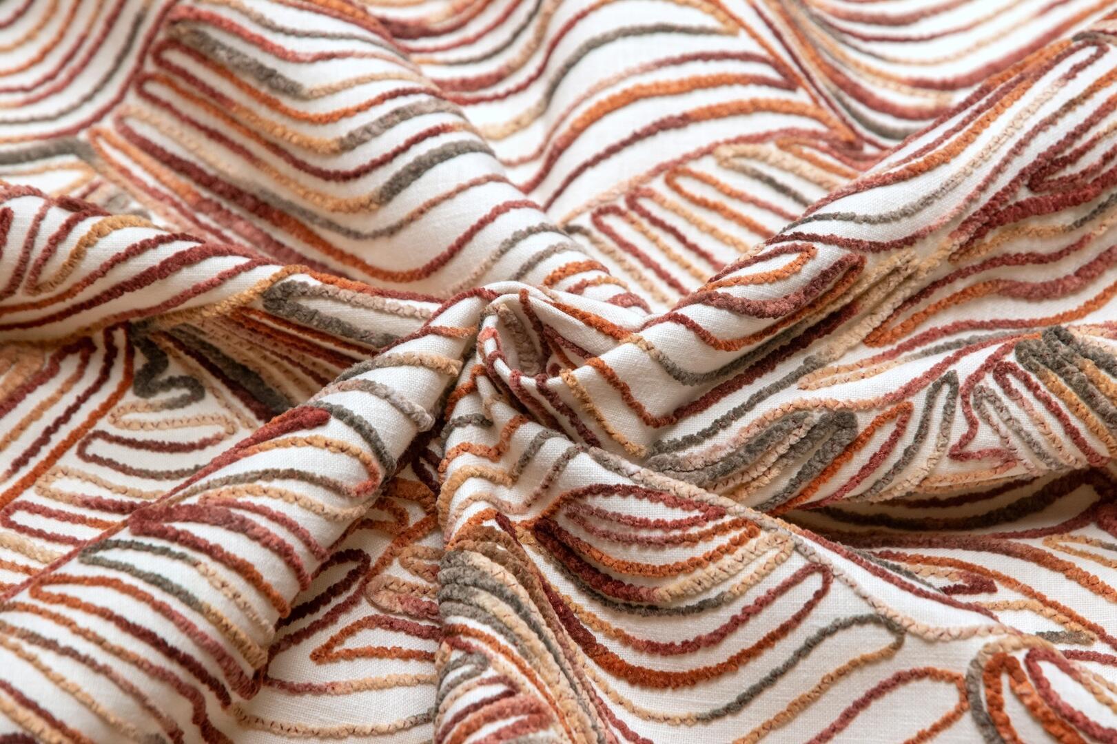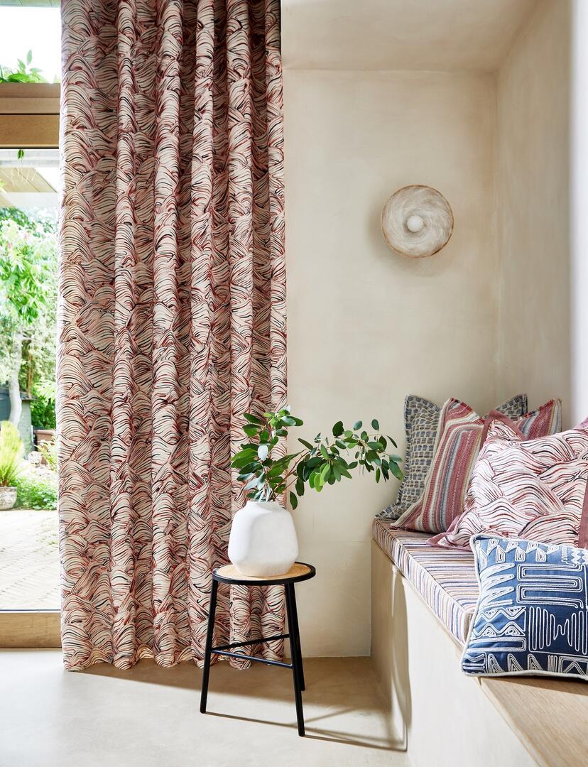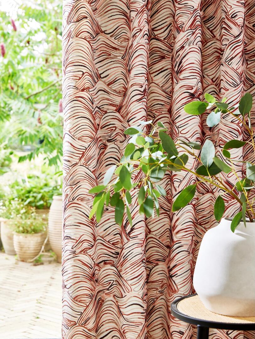 De Liyana-gordijnstof is een waar kunstwerk, met een uniek patroon van gehaakte sliertjes die in een verrassende, golvende opbouw zijn aangebracht. Het resultaat is een levendig en sculpturaal effect dat direct de aandacht trekt. Dit soort stof is uiterst zeldzaam en wordt met zorg geproduceerd, wat betekent dat het vaak een hele dag duurt om slechts één rol te maken. De stof is verkrijgbaar in twee mooie kleuren: een warme terracotta-bronsachtige tint, getoont op de sfeerfoto, en een combinatie van roze, fuchsia en grijstinten voor een zachte, rustige uitstraling. Wil je eerst een proefstuk zien en voelen voordat je een op maat gemaakt gordijn bestelt? Dat kan! Vraag een knipstaal aan, dat meestal dezelfde dag nog wordt verzonden, zodat je de textuur en kleur goed kunt beoordelen.
