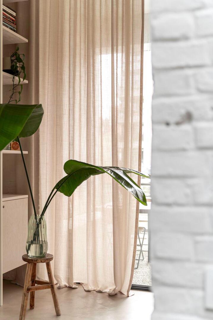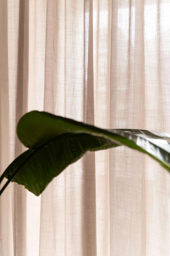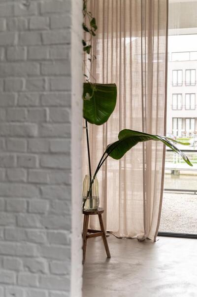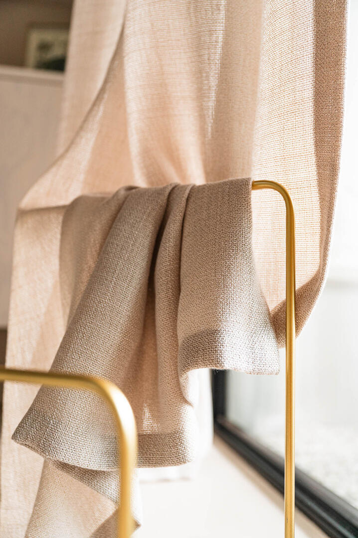 Luce is ontworpen voor ruimtes waar daglicht een belangrijke rol speelt. De stof laat het licht op een rustige manier binnenkomen, waardoor de omgeving helder blijft zonder dat je inlevert op sfeer of geborgenheid. Door de relatief dichte inbetween-kwaliteit voelt Luce voller aan dan veel andere transparante stoffen, wat haar geschikt maakt voor zowel woon- als werkruimtes waar een subtiel evenwicht tussen privacy en licht gewenst is. Wanneer je naar het weefbeeld kijkt, zie je een speels patroon dat bestaat uit fijne, ongelijkmatige lijnen die elkaar kruisen. Deze lijnen vormen een licht golvend raster dat op sommige plekken hechter en op andere plekken losser oogt. De verticale banen in de stof zorgen daarbij voor een rustig ritme: in de plooien ontstaat een afwisseling van smallere en bredere stroken waarin het licht telkens net anders wordt gevangen. Het geheel geeft de indruk van een natuurlijk, ritmisch lijnenspel dat moeiteloos past in uiteenlopende interieurs.
