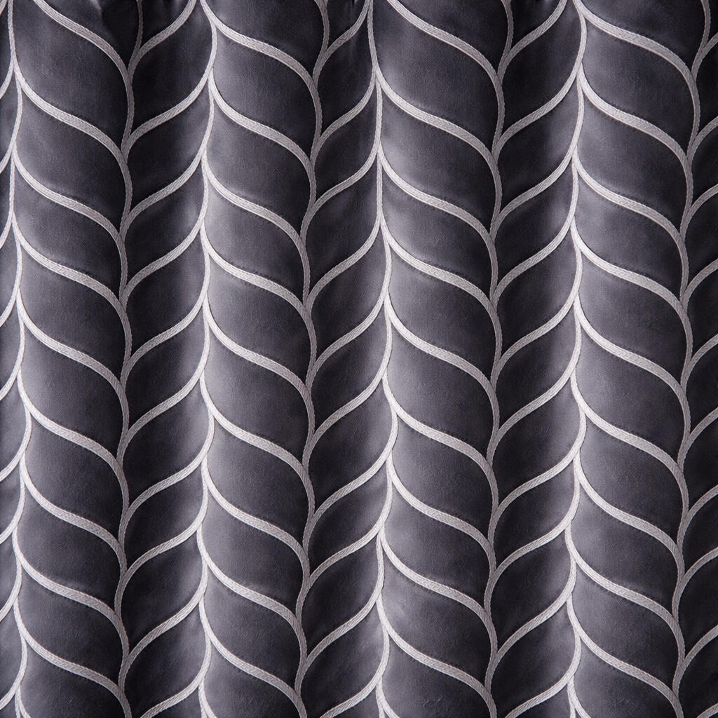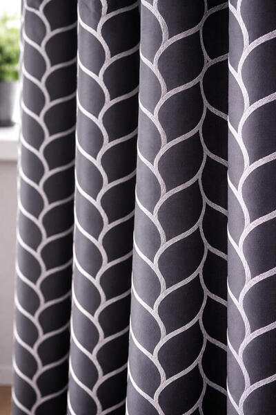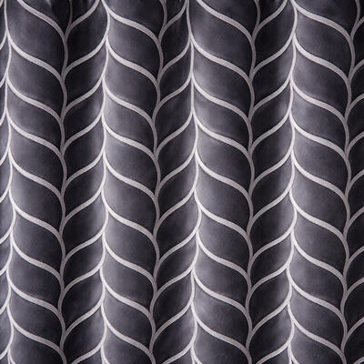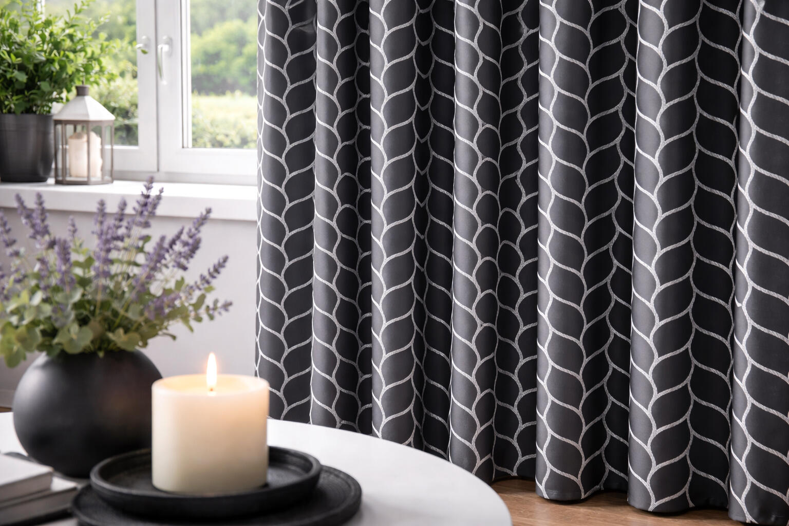 Graphite grijs: een diepe, moderne kleur waarbij het lichte patroon juist krachtig contrasteert met de donkere ondergrond. De structuur van het dessin springt hier duidelijk naar voren en geeft het gordijn een uitgesproken uitstraling.