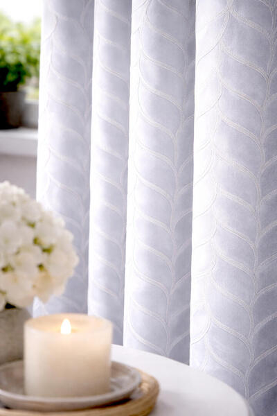 Het gordijn Luminelle kenmerkt zich door een verfijnd, golvend patroon dat doet denken aan overlappende bladeren. Het motief loopt verticaal over de stof en volgt de plooien van het gordijn op een natuurlijke manier, waardoor er een rustig ritme ontstaat in het interieur. De licht verhoogde lijnen in het dessin zorgen voor een tastbare structuur en geven de stof een levendig karakter wanneer het licht erop valt.