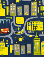 Het gordijn City Life brengt een complete stad in beeld, vol gebouwen, wegen en voertuigen. In het patroon zie je hoge woontorens, kleine huizen, hotels, bruggen en straten die zich in zachte bochten over de stof bewegen. Tussen de wegen rijden bussen, auto’s en vrachtwagens, terwijl een helikopter boven de daken vliegt. Ook kleine details zoals verkeerslichten, fietsen, bomen en bordjes met teksten als Side Walk en City Life geven het geheel een speels en herkenbaar karakter.