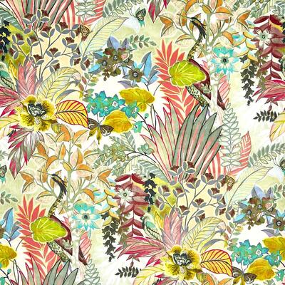 Het gordijn Hidden Paradise is een zijdezachte velours stof die een bijzonder zachte textuur biedt. Het motief is haarscherp en met uiterste precisie op de stof aangebracht, waardoor elk detail tot leven komt. Het patroon is groot en imposant, met een patroon van maar liefst 142 cm, waardoor je bij langere blik steeds meer verborgen details zult ontdekken. Het ontwerp toont een rijk landschap vol weelderige flora en fauna, met grote bladeren en bloemen die zich over de stof uitspreiden, en binnen het patroon zijn subtiele dieren verscholen. Zo zijn er onder andere een verschillende tropische vogels waaronder een scene met twee kleurrijke vogels die gefascineerd naar elkaar kijken, evenals  vlinders en een aparte sprite die zich tussen de bladeren verbergt. Hoe langer je er naar kijkt, des te meer verrassingen je meent te zien. De stof is in vier kleuren verkrijgbaar: een licht ecru zoals op de sfeerfoto, een warme bronskleurige tint, een patrol-variant en een diep blauwe uitvoering. Wil je eerst de textuur en kleur van de stof voelen en zien voordat je een maatwerk gordijn bestelt? Bestel dan een knipstaal. Deze worden meestal dezelfde dag nog verzonden, zodat je zonder haast kunt bepalen of deze stof past bij jouw interieur. Voor extra comfort en optimale isolatie tijdens het gebruik kun je tijdens het bestelproces kiezen voor een voering.