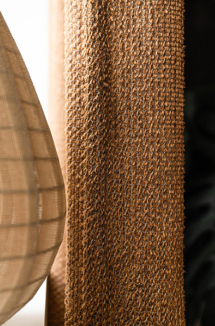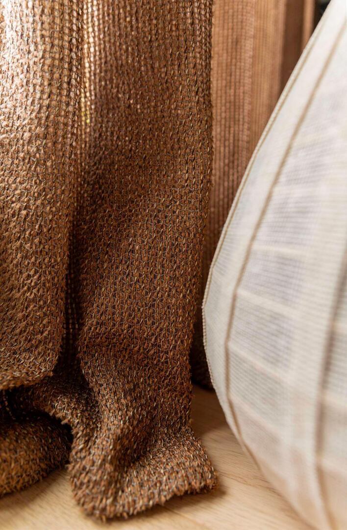 Ervaar de unieke nuances van het Riad in-between gordijn, een stoffering die zich perfect leent als zowel in-between als overgordijn, met name wanneer gecombineerd met een voeringstof. De Riad stof straalt een ambachtelijke charme uit, te danken aan de bijzondere samenstelling van het materiaal. Het ontwerp bestaat uit een mesh-achtige structuur die zijn karakter ontleent aan het gebruik van twee gespecialiseerde kettingdraden. Wat dit gordijn bijzonder maakt, is de combinatie van harige garens die een weelderig volume toevoegen, en getwiste garens in diverse tinten die de diepte van de stof benadrukken. Deze samensmelting van elementen introduceert een gewaagde dimensie in elk interieur, waardoor het Riad gordijn echt opvalt. Het motief is een mengelmoes van aardetinten, waarbij bruine en gouden schakeringen elkaar afwisselen en zo een warme maar dynamische uitstraling geven. De veelkleurigheid van het garen zorgt voor een speelse, levendige toets die prachtig contrasteert met iedere ruimte.