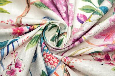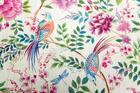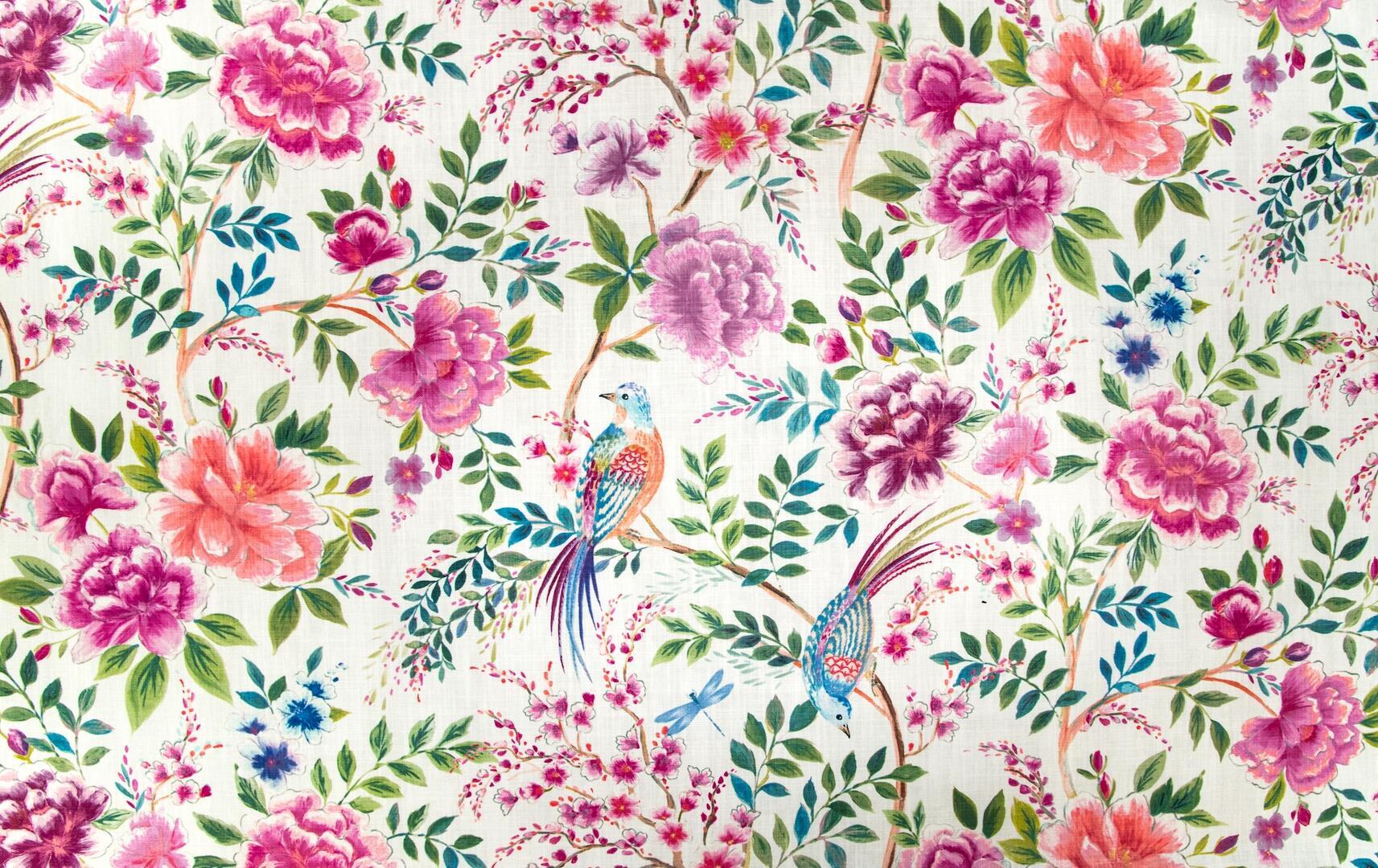 Op de lichte ondergrond ontvouwt zich een rijk botanisch tafereel. Grote bloemen in tinten roze, oudroze en magenta vormen het hart van het dessin. Tussen deze bloemen groeien fijne takjes met kleine bloesems in zachtroze en lichtrood, aangevuld met fris groen blad in verschillende tinten – van zacht saliegroen tot dieper bosgroen. Tussen de bloemen zitten twee sierlijke vogels. De eerste vogel heeft een opvallend verenkleed met blauw, turquoise, warm oranje en zacht geel, gecombineerd met een lange sierlijke staart met rode en blauwe accenten. De tweede vogel is speelser gepositioneerd op een tak en heeft een lichaam met lichtblauwe en turquoise tinten, een subtiel roze patroon op de vleugel en een lange bordeauxrode staart.