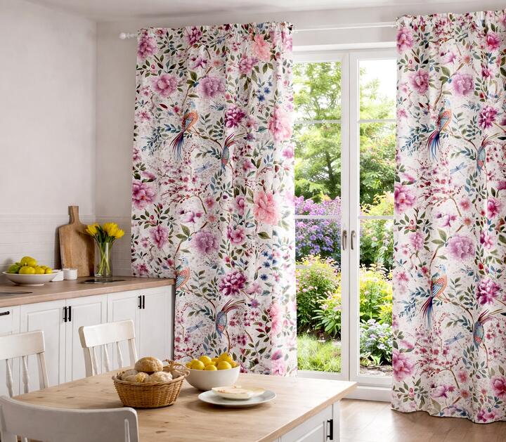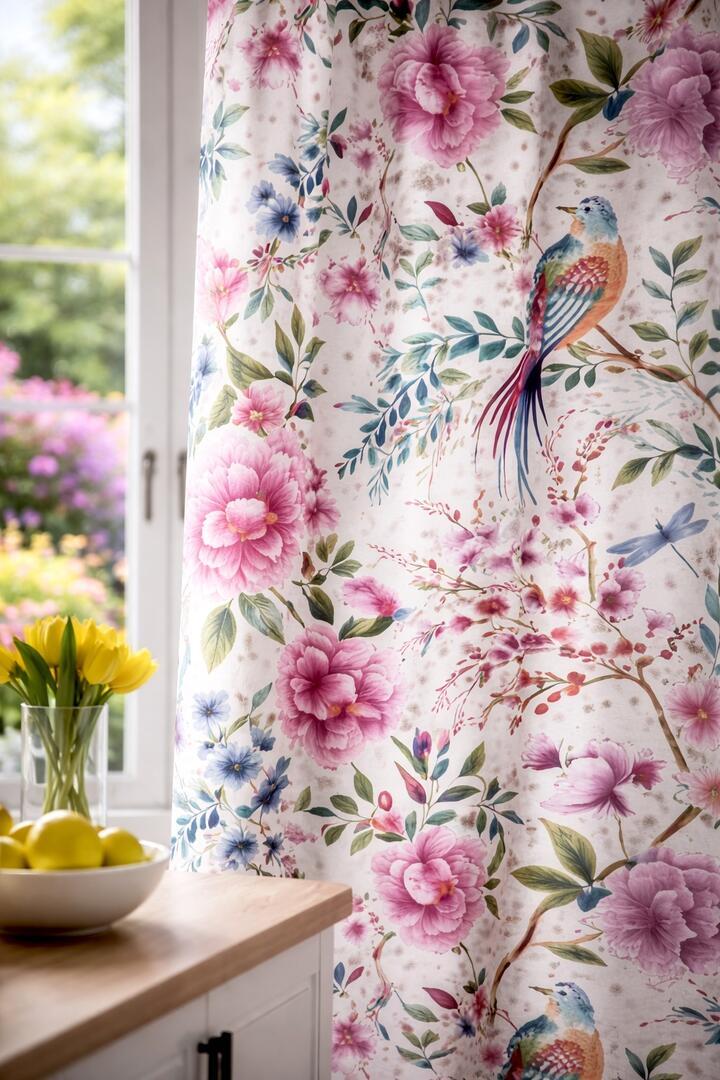 Met het Songbird Garden gordijn breng je een levendig tuinmotief in huis. Het ontwerp toont sierlijke takken met weelderige bloemen, speelse bladeren en twee opvallende zangvogels die tussen het bloeiende groen zijn afgebeeld. Het patroon heeft een natuurlijke, schilderachtige uitstraling waardoor het gordijn perfect past in een woonkeuken, woonkamer of slaapkamer waar een warm en huiselijk karakter gewenst is.