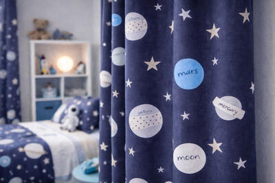 Het gordijn Space Mission brengt de wondere wereld van het heelal rechtstreeks de kinderkamer in. Op de dikke, donkerblauwe stof schitteren planeten in verschillende tinten lichtblauw en grijs, alsof ze zweven in de nachtelijke ruimte. Tussen de planeten fonkelen kleine witte sterren die het geheel een speels en ruimtelijk effect geven. Wat dit gordijn extra leuk maakt, zijn de namen die op de planeten staan: Jupiter, Mars, Venus, Saturnus en Moon – perfect voor kleine ruimtevaarders die alles willen weten over het zonnestelsel. De print is helder, fantasierijk en ideaal voor kinderen die dromen van raketten, astronauten en verre planeten. De stof is van uitstekende kwaliteit: stevig, soepel en prettig aanvoelend. Ze hangt mooi en blijft lang goed, zelfs bij dagelijks gebruik. De diepe blauwe kleur zorgt bovendien voor een rustgevend effect in de kamer, waardoor het gordijn niet alleen mooi is om naar te kijken, maar ook functioneel voor een fijne nachtrust. Tijdens het bestelproces kun je de optie “Voering” aanvinken voor extra isolatie en verduistering.