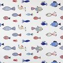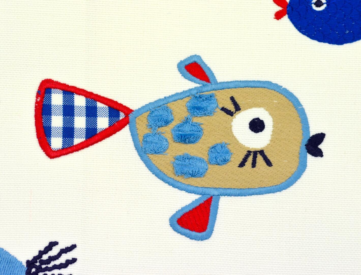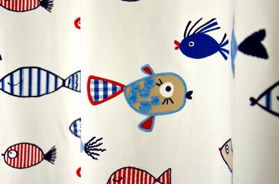 Het gordijn Tiddlers brengt een levendig zee-thema in huis met een patroon dat direct opvalt door de combinatie van borduurwerk en echte stukjes stof die in de figuren zijn verwerkt. Op de lichte, mat geweven katoenondergrond – met een zachte, iets geribde linnenstructuur – zwemmen vrolijke visjes, inktvisjes en andere zeediertjes in tinten blauw, rood, zand en crème. Sommige vissen hebben staarten van ruitjes- of streepstof, terwijl andere zijn gevuld met kleine lapjes die extra diepte geven. In de details zie je hoe zorgvuldig alles is opgebouwd: het grotere visje met de geborduurde schubben is afgewerkt met kleine, zachte kwastjes op zijn lijfje, wat het geheel een speels en bijna aaibaar karakter geeft.