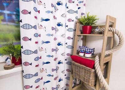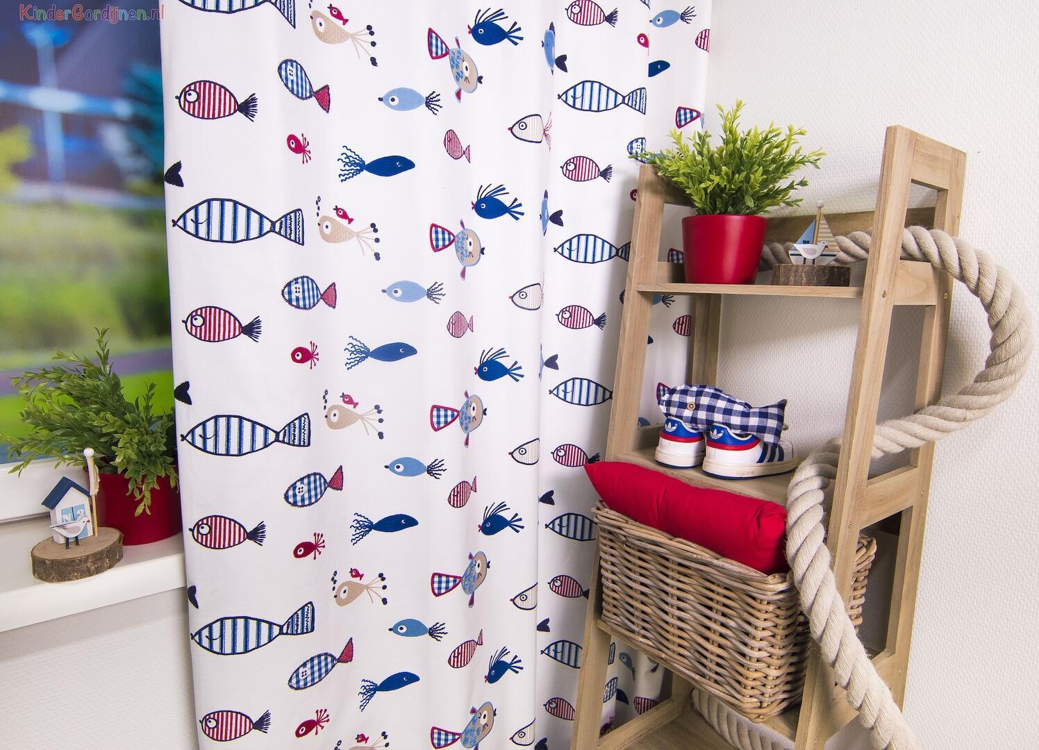 Tiddlers is verkrijgbaar in twee kleuruitvoeringen die elk hun eigen sfeer hebben. In de ene variant ligt de nadruk op frisse blauwtinten gecombineerd met rood en wit, wat het nautische gevoel versterkt en mooi past in een maritiem of strandachtig interieur. De andere lichtblawe uitvoering heeft een iets warmere uitstraling met meer zand- en natureltinten, waardoor de zeedieren zachter afsteken tegen de achtergrond en het gordijn rustiger oogt. In beide varianten blijven de geborduurde contouren, de stofapplicaties en de kleine kwastjes duidelijk zichtbaar, waardoor het dessin rijk blijft zonder druk te worden.