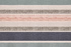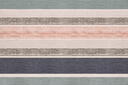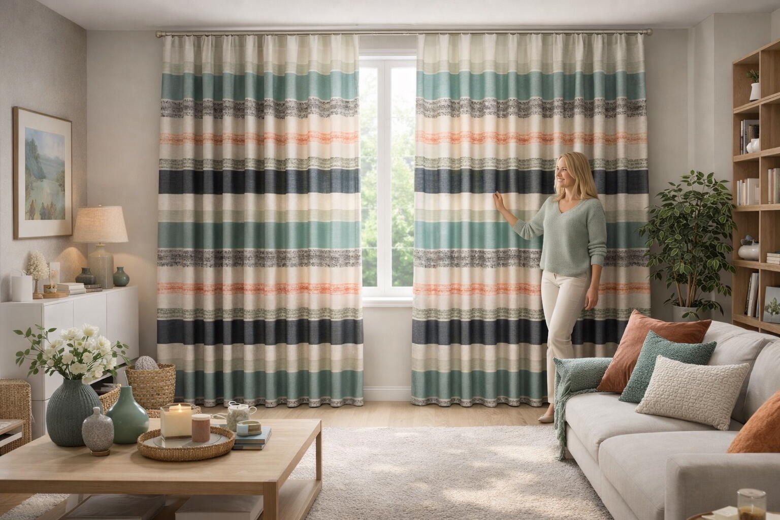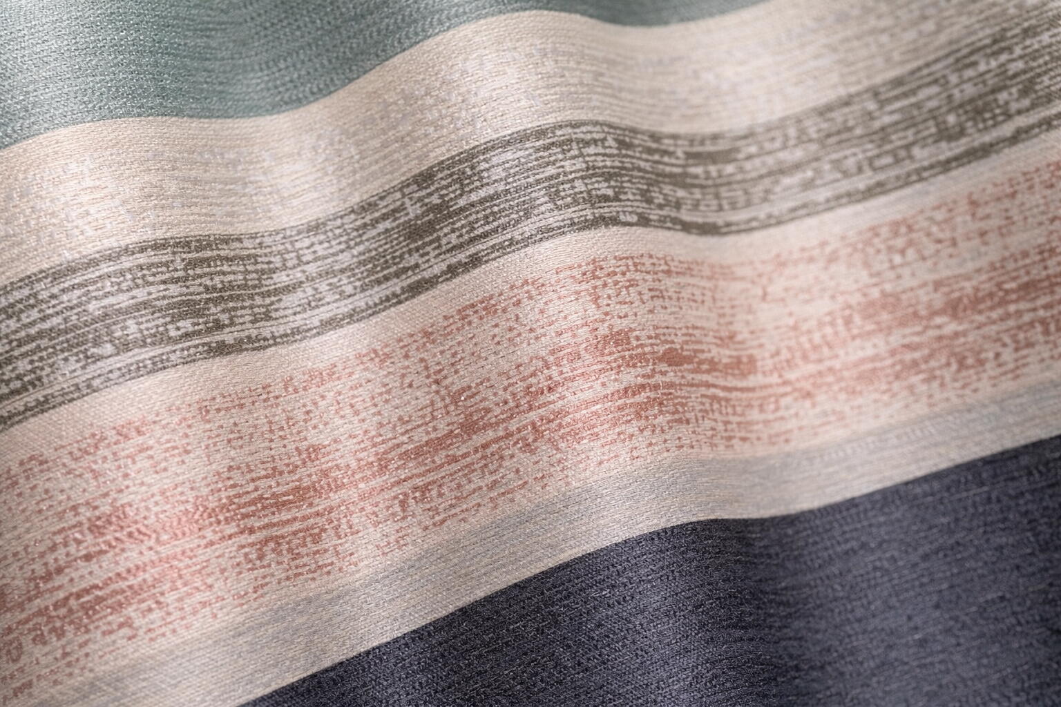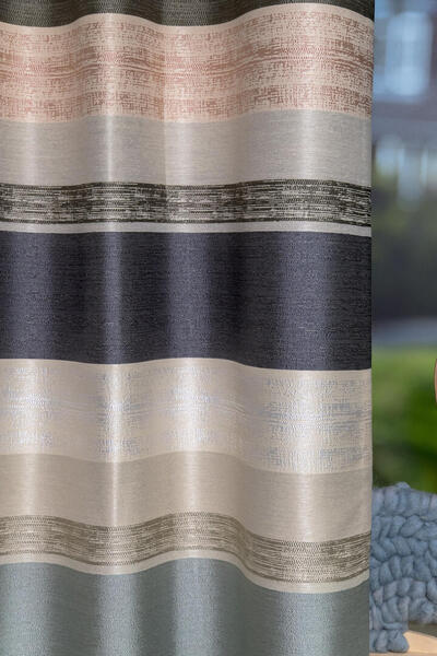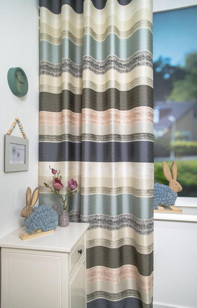 Het gordijn Gigante is een karaktervolle jacquard geweven gordijnstof met een breed, horizontaal streepdessin dat direct de aandacht trekt. In de stof lopen banen in zacht groenblauw, warm beige, roomwit, antraciet en een subtiele perziktoon vloeiend in elkaar over. Tussen de effen stroken liggen fijn gemêleerde lijnen met een licht onregelmatig patroon, wat het geheel een levendige, bijna handgemaakte uitstraling geeft.