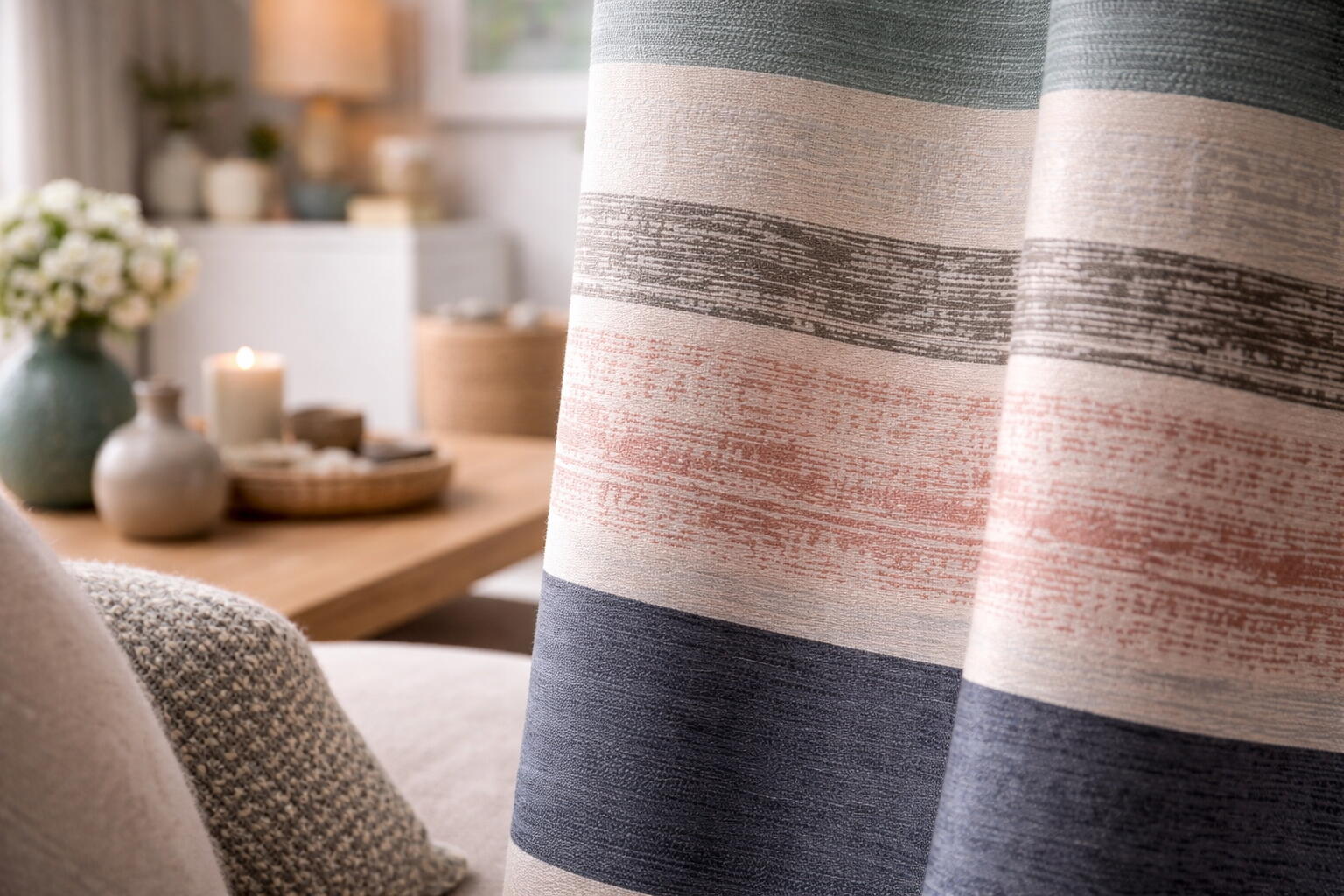 De jacquard weving geeft de stof een stevige maar soepele valling. De structuur is duidelijk voelbaar: de fijn gemêleerde banen hebben een iets ruwer oppervlak, terwijl de effen strepen gladder en zachter aanvoelen. Dit zorgt voor een mooi contrast wanneer je het gordijn van dichtbij bekijkt of aanraakt. De horizontale strepen geven het raam een rustige, brede uitstraling en maken de ruimte optisch ruimer.