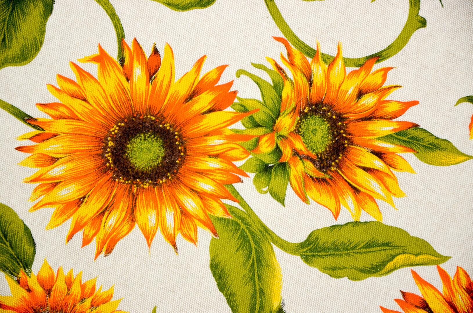 De achtergrond heeft een rustige, naturel uitstraling met een lichte ecru toon die doet denken aan ongebleekt katoen of canvas. Dit geeft het dessin een zachte basis waardoor de kleuren van de zonnebloemen mooi naar voren komen zonder te overheersen. Het patroon oogt levendig, maar blijft prettig in gebruik doordat de elementen op een natuurlijke manier over de stof zijn verdeeld.