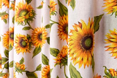 Het gordijn Zonova brengt een warme en levendige sfeer in huis dankzij het uitgesproken bloemmotief. Grote zonnebloemen zijn verspreid over de stof en trekken op een natuurlijke manier de aandacht. De bloemen zijn rijk uitgewerkt met volle bloemblaadjes in tinten geel, oker en zacht oranje, gecombineerd met diepe bruintinten in het hart. Tussen de bloemen zorgen groene bladeren en stelen voor balans en een speelse verdeling over het geheel.