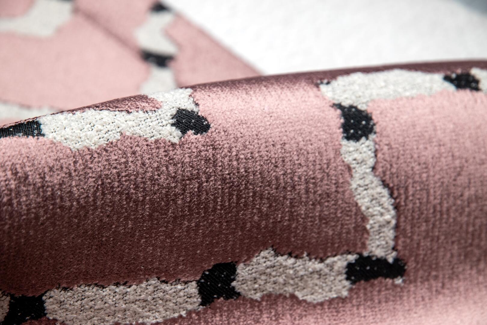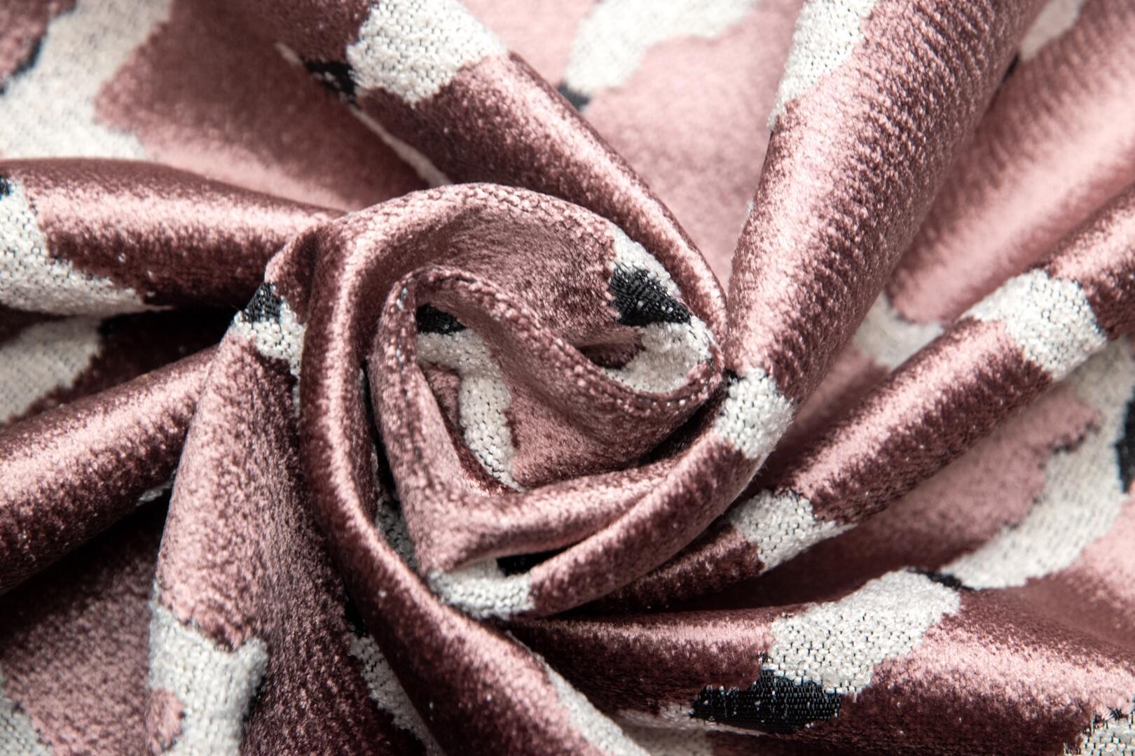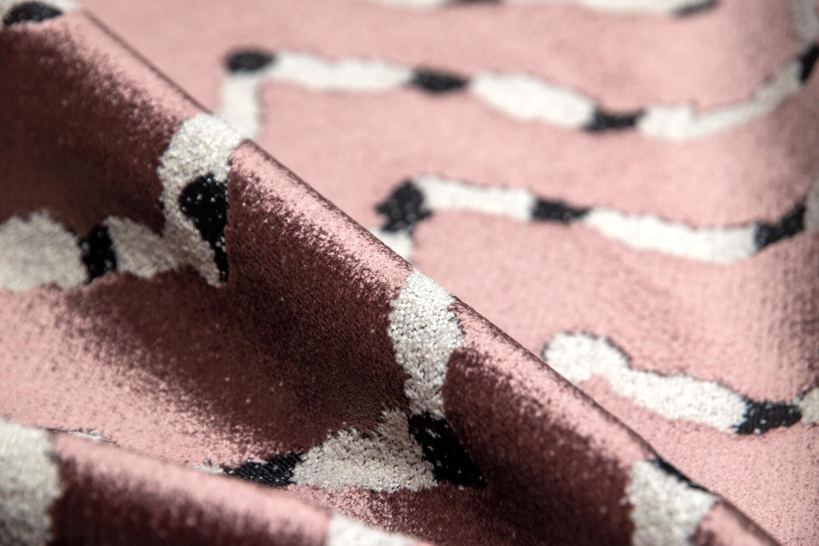 Een verfijnde roze ondergrond met een lichte poederachtige uitstraling. Het contrasterende lijnenspel springt subtiel naar voren en geeft het gordijn een speels maar gebalanceerd karakter. Deze variant voegt warmte toe zonder overheersend te zijn.