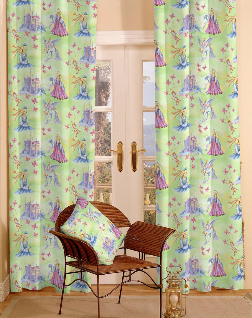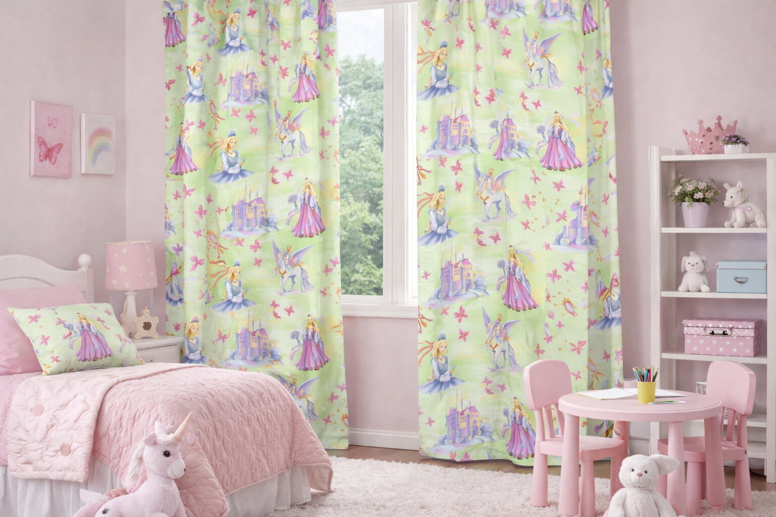 Laat de fantasie van je kleine prinses tot leven komen met ons Unicorn Prinses gordijn. Dit zacht groen-gele gordijn is versierd met prachtige afbeeldingen van prinsessen gehuld in mooie roze en blauwe jurken, een gracieuze eenhoorn en een majestueus paleis omringd door schattige roze vlindertjes.