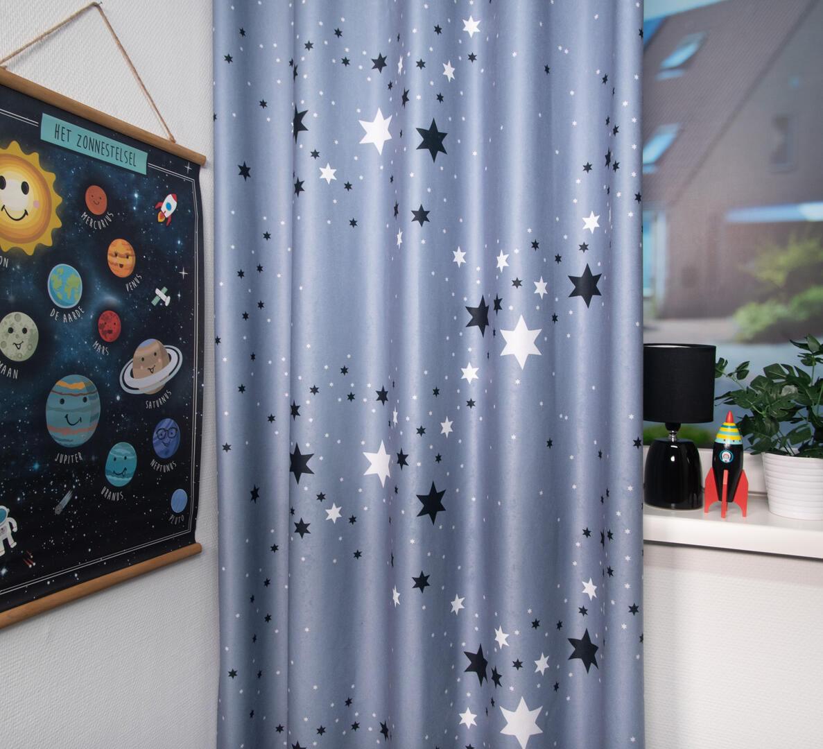 De Celestial Stars is gemaakt van fluweelzachte velvet stof, waardoor het niet alleen prachtig oogt, maar ook heerlijk aanvoelt. Met zijn succesvolle kleurstellingen zal dit gordijn een echte blikvanger zijn in de kinderkamer. Kies uit vier kleurrijke combinaties: marineblauw met lichtblauwe en witte sterren, grijs met lichtgrijze en zwarte sterren, ecru met paarsvioletkleurige sterren en antraciet met paarsvioletkleurige sterren. Deze kleuren zullen de ruimte laten stralen!