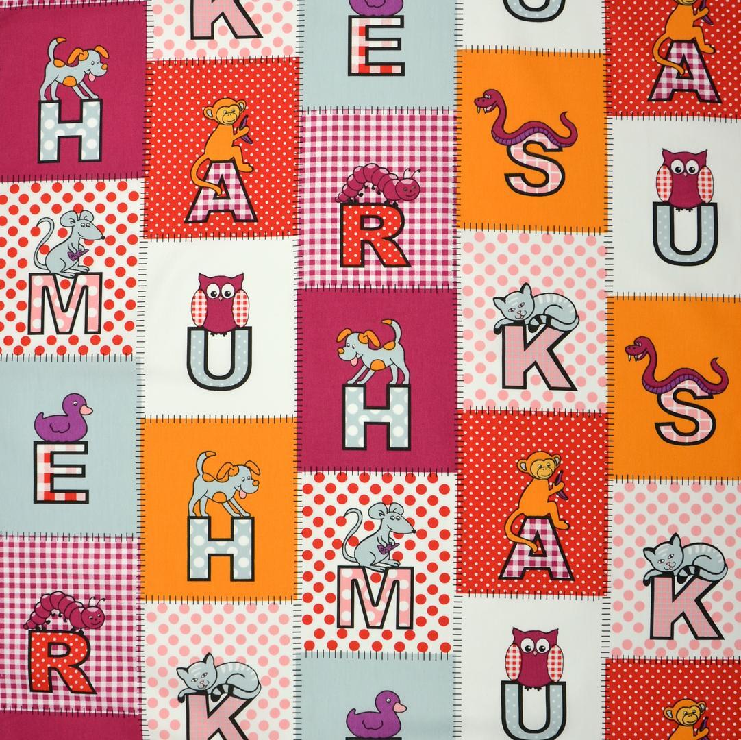 Het Letterblocks gordijn is een vrolijke blikvanger voor iedere baby- en kinderkamer. De stof is opgebouwd uit een mozaïek van vierkante blokken, elk met een eigen achtergrondkleur en dessin. In elk blok staat een letter, gecombineerd met een lief dier of figuurtje, zoals een aapje, uil, muis, hondje, eendje of slang. Zo ontstaat een levendig en speels geheel dat uitnodigt om steeds opnieuw te kijken.
