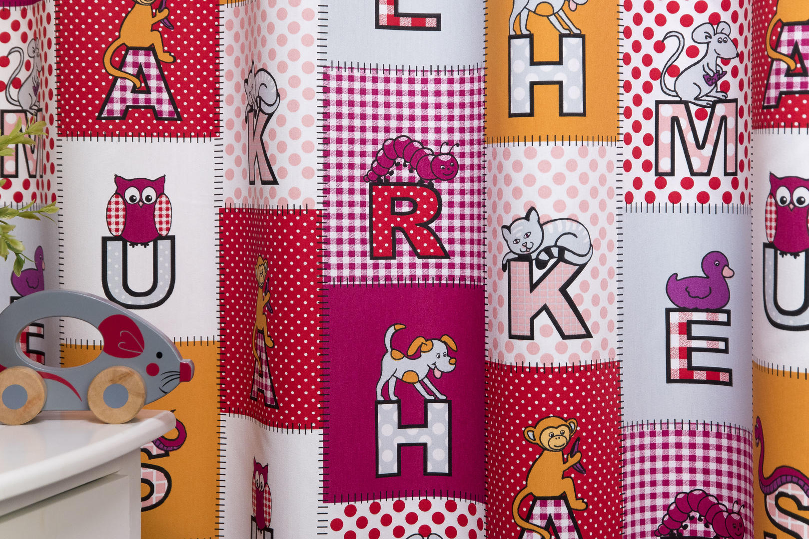 In elk blok staat een letter van het alfabet met daarboven of erop een speels dier. Een kat ligt lui op de K, een rups kruipt over de R, een aapje balanceert op de A en een uiltje zit op de U. Deze combinatie van letters en figuurtjes maakt het gordijn niet alleen decoratief, maar ook leuk om samen naar te kijken en verhalen bij te verzinnen.