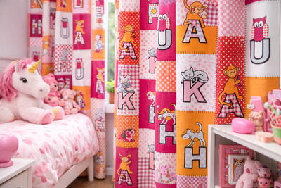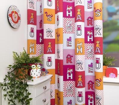 De stof heeft een gladde, fijne weving met een matte uitstraling. Hierdoor komen de kleuren helder naar voren zonder te glanzen. De stof voelt stevig aan en valt mooi in plooien, waardoor het patroon goed zichtbaar blijft wanneer het gordijn hangt. De print is scherp en gelijkmatig aangebracht, zodat elk detail van de figuurtjes en letters duidelijk zichtbaar is.