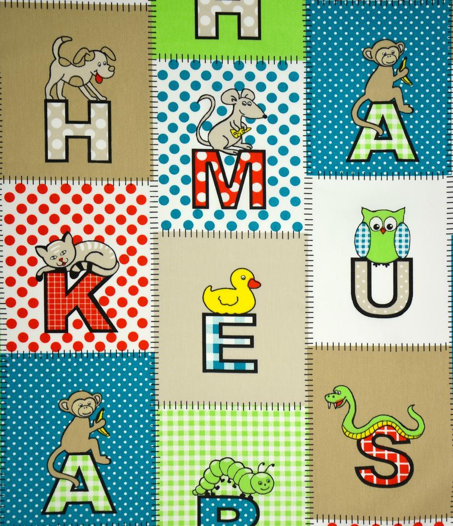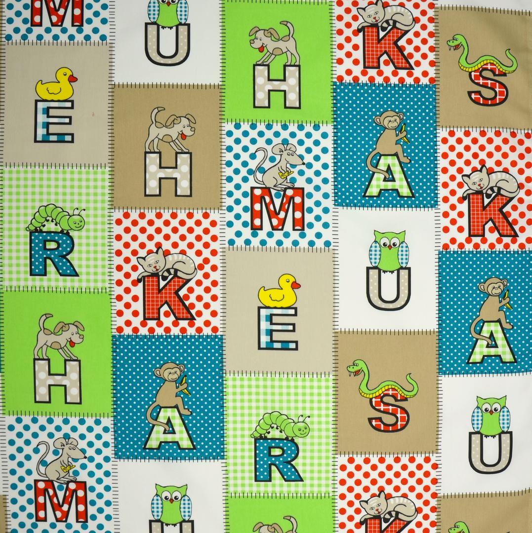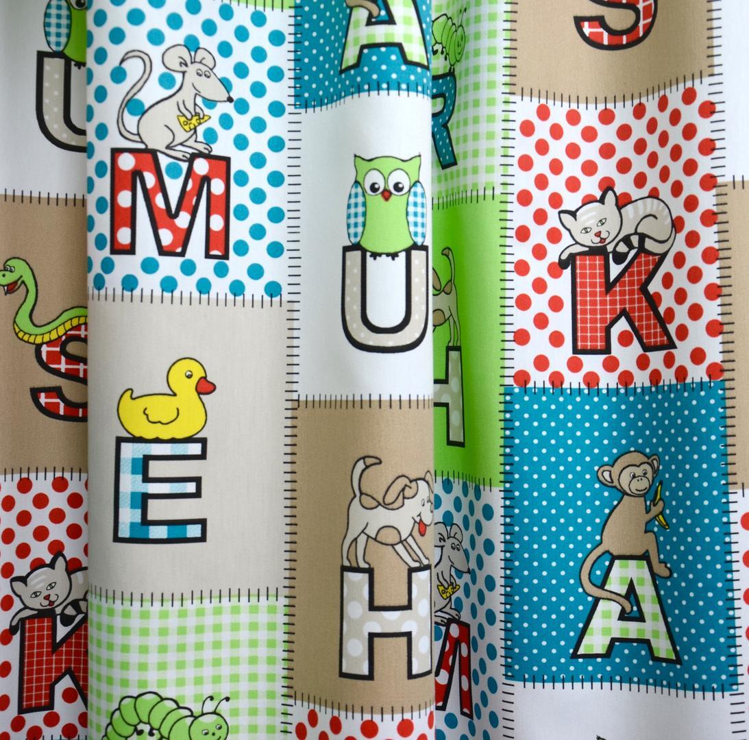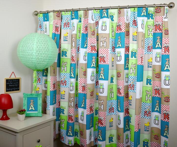 Het Letterblocks gordijn is een vrolijke blikvanger voor iedere baby- en kinderkamer. De stof is opgebouwd uit een mozaïek van vierkante blokken, elk met een eigen achtergrondkleur en dessin. In elk blok staat een letter, gecombineerd met een lief dier of figuurtje, zoals een aapje, uil, muis, hondje, eendje of slang. Zo ontstaat een levendig en speels geheel dat uitnodigt om steeds opnieuw te kijken.