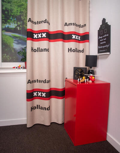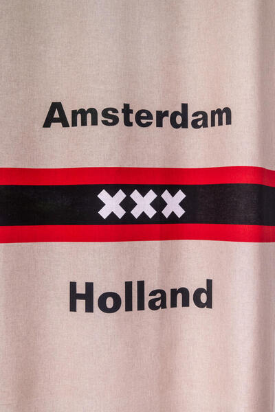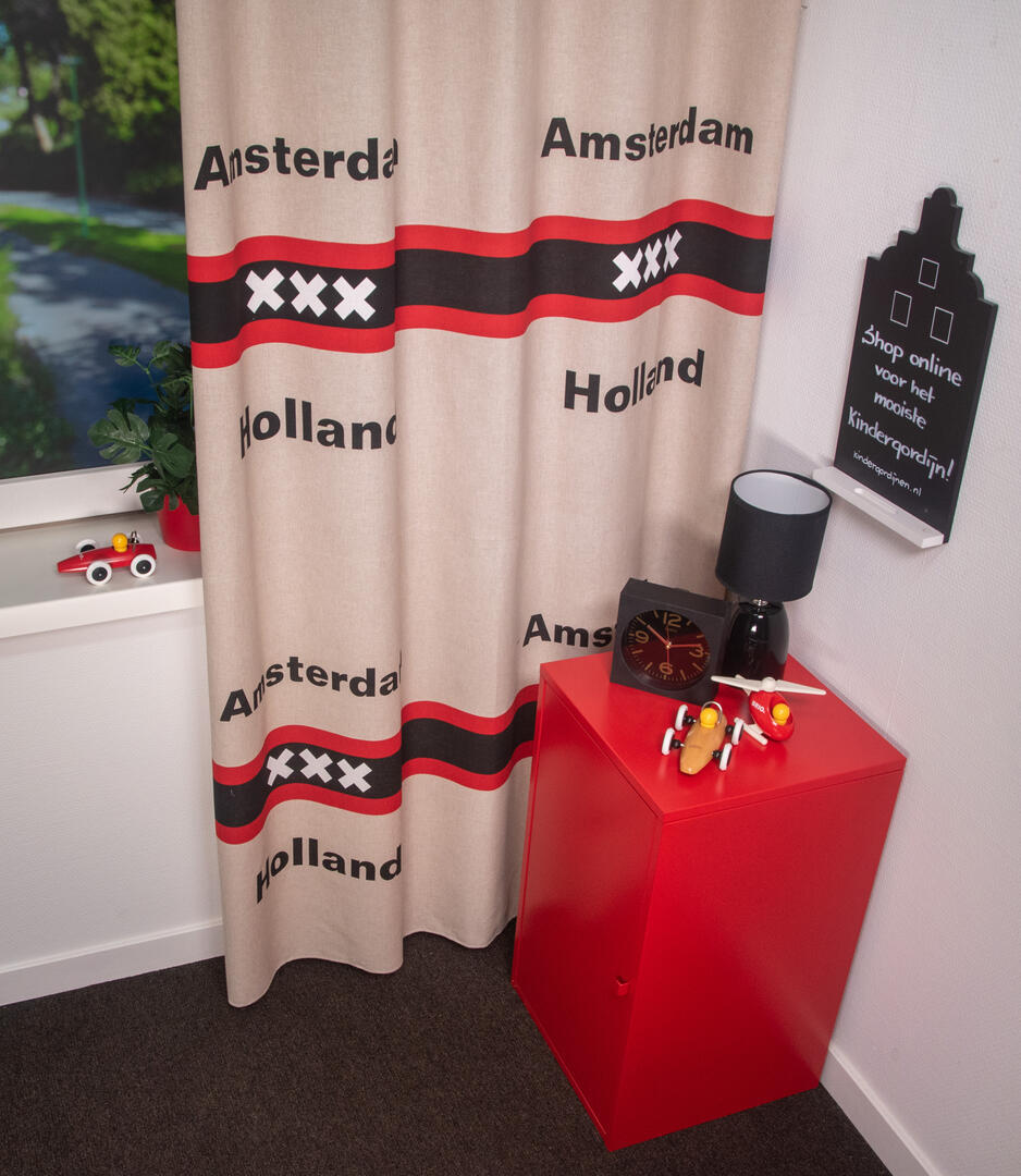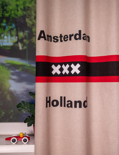 Het Amsterdam Holland gordijn is een uniek product gemaakt van duurzame canvas stof, met het wapen van Amsterdam erop - de herkenbare 3 witte kruisjes in een zwarte horizontale baan omlijnd door twee rode strepen aan boven en onderzijde. Dit gordijn is kamerhoog, waardoor er geen vervelende naden zijn, maar let op, het heeft als gordijn een hoogtebeperking van 260 cm. Natuurlijk is deze stof ook als losse stof verkrijgbaar.