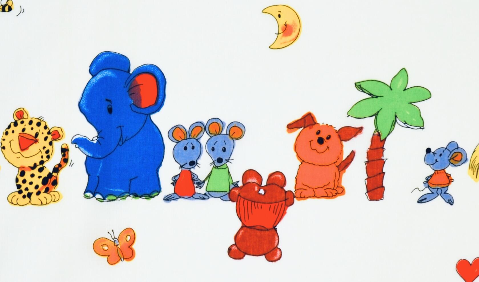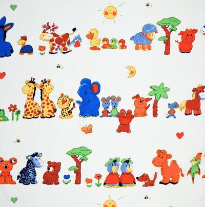 De achtergrond van de stof is gebroken wit tot zacht crème, wat het patroon rustig en licht houdt. Hierop komen de dieren extra mooi naar voren. De kleuren zijn helder maar niet schreeuwerig.