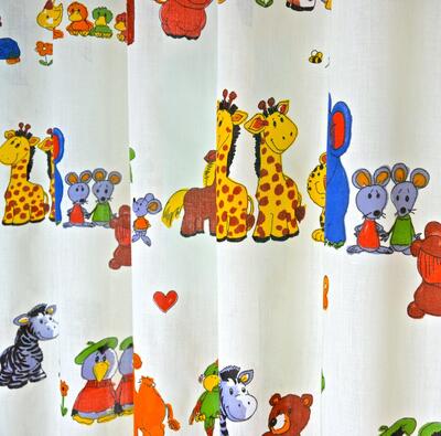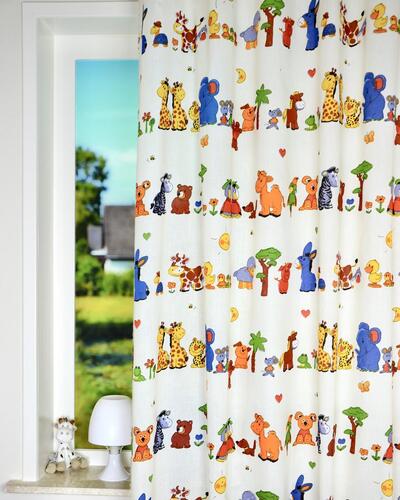 De stof heeft een fijne, licht zichtbare weving en een matte uitstraling. Hierdoor voelt het gordijn prettig aan en komt de print mooi egaal over. De stof valt soepel en vormt mooie plooien, waardoor de dierenrijen netjes zichtbaar blijven wanneer het gordijn hangt. Het materiaal is stevig genoeg voor dagelijks gebruik in een kinderkamer, maar voelt tegelijkertijd zacht aan.