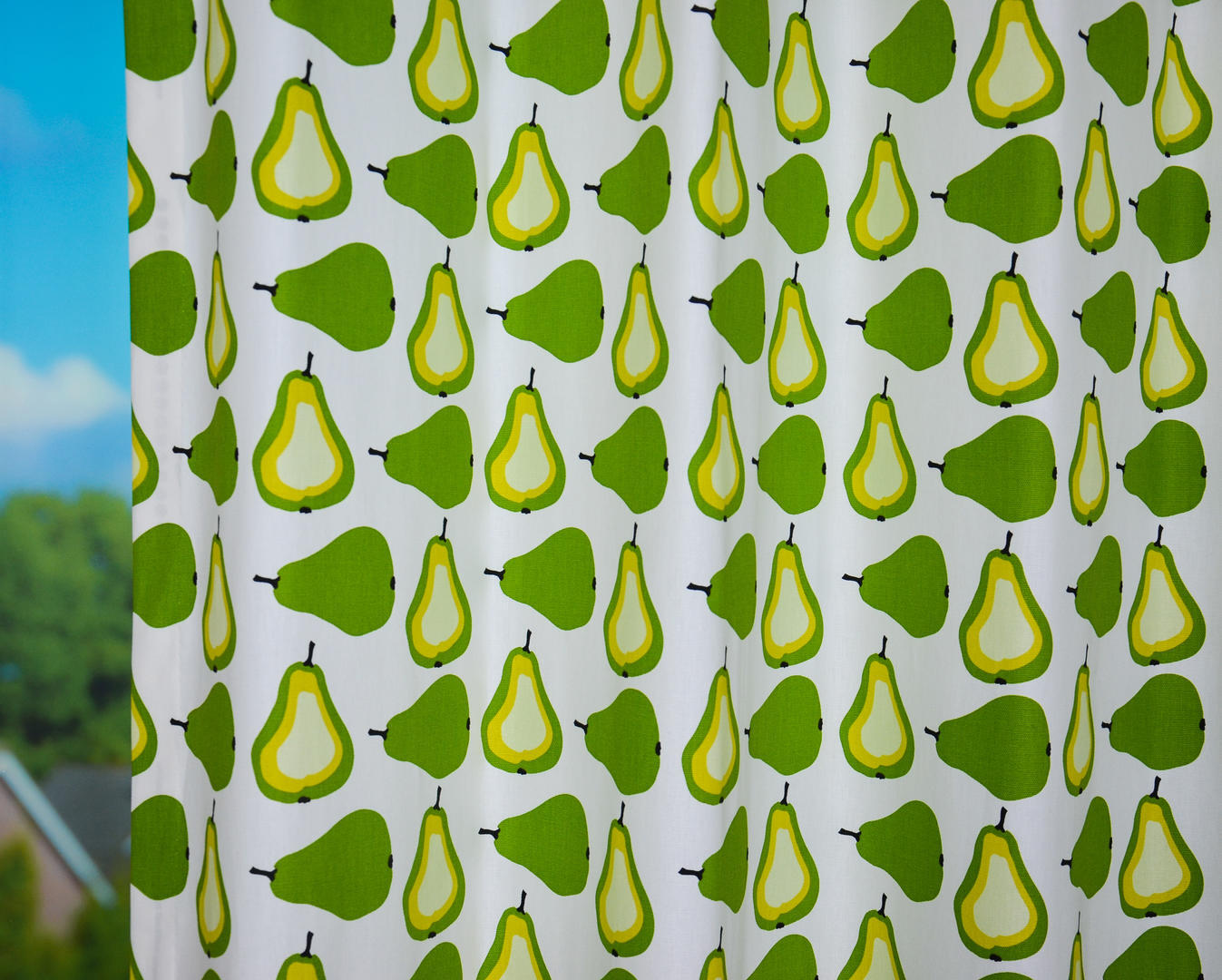 Een RETRO gordijn van appeltjes of perenstof! De frisse kleur ademt direct een warme sfeer in de kamer. De ondergrond heeft een zandkleurig linneneffect en bij de appeltjes stof en een warm witte ondergrond bij de perenstof, kleuren die bijdragen aan die gave vintagelook. De appel en peren print zijn gedrukt op de voorzijde, ze zijn 10 cm in doorsnede.