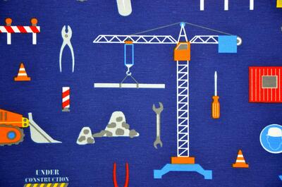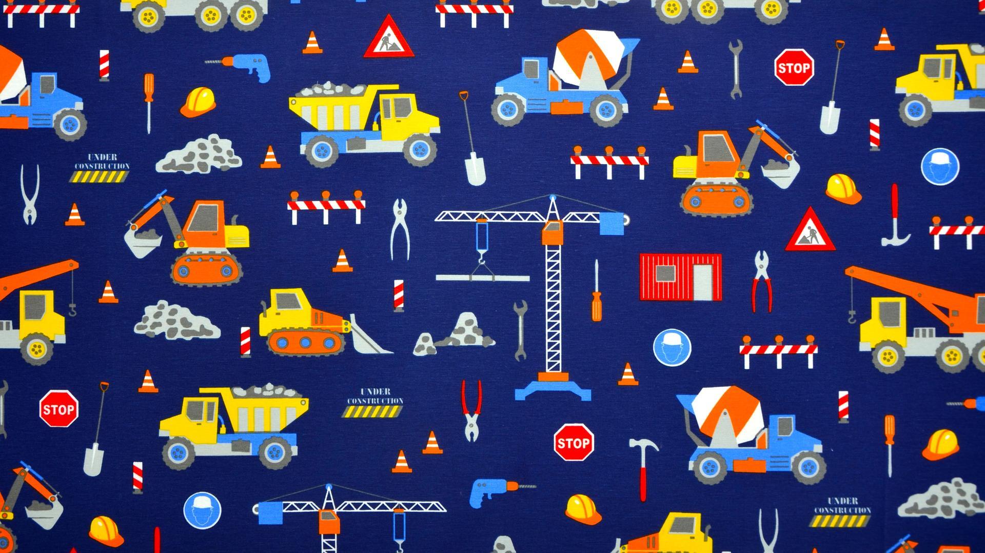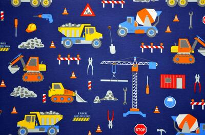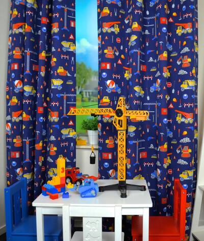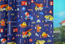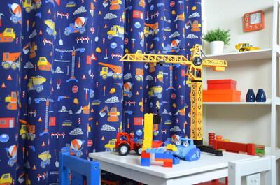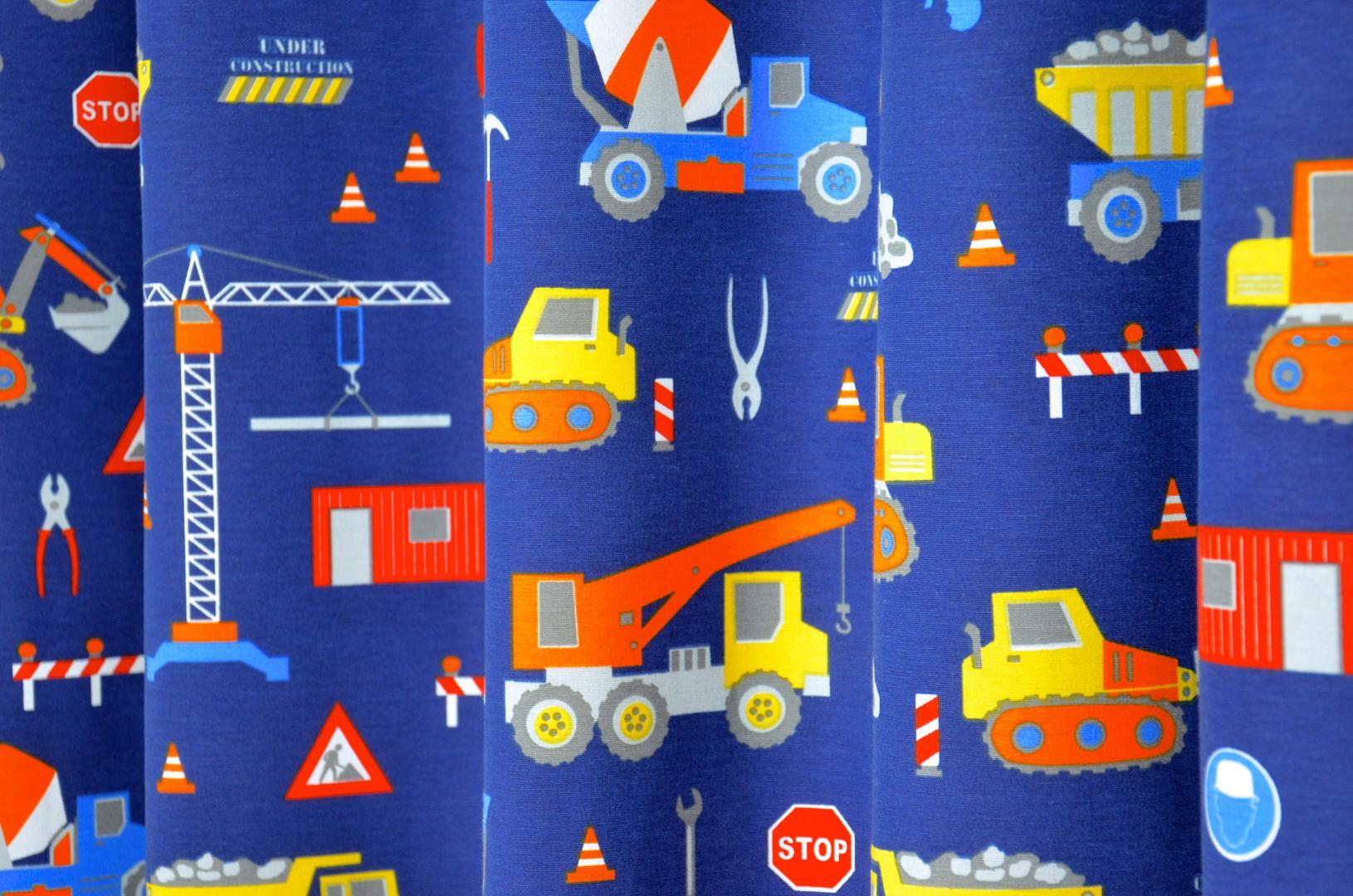 Werk aan de weg! Van kiepwagen, graafmachine tot veiligheidshelm; het staat allemaal afgebeeld op dit stoere jongensgordijn. Je kan zo vanuit je eigen bed een fantasie verhaal bedenken! Wat gaat er vandaag gebeuren op de bouwplaats? Is het ruw terrein of misschien zelfs een kiezelgroeve? De vrachtwagens zijn zo’n 14 x 8 cm groot en gedrukt op diep donkerblauwe sportieve stof. De vrolijke kleuraccenten geel, oranje, rood zijn leuk om verder te gebruiken in de slaapkamer. Voor kleurbehoud van de terreinwagens én het gordijn, even laten voeren. Dan is het óók direct prettig donker.