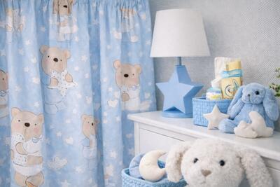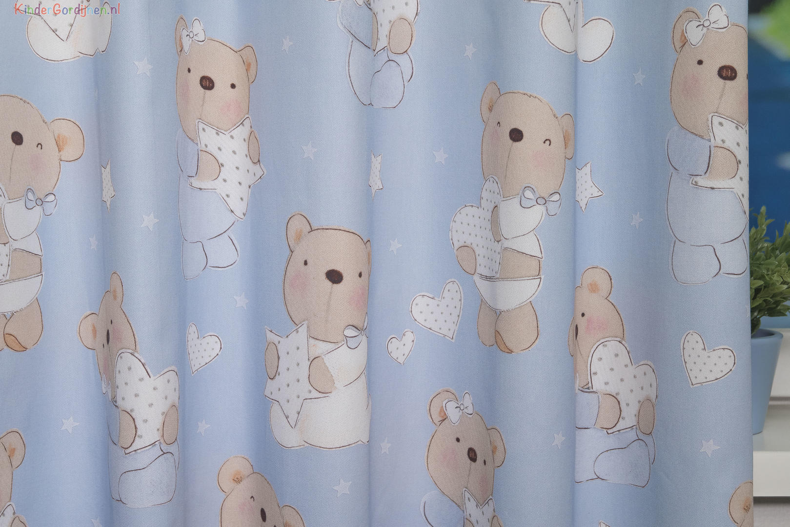 Babybear Blauw De vergrijsd blauwe uitvoering heeft een rustige, eigentijdse uitstraling. De lichtblauwe ondergrond is zacht en niet fel, waardoor het gordijn goed combineert met zowel witte als houten meubels. De teddybeertjes zijn uitgevoerd in warme zand- en crème tinten, wat zorgt voor een mooi contrast. Deze kleur is zeer geschikt voor een jongenskamer of een neutrale babykamer.