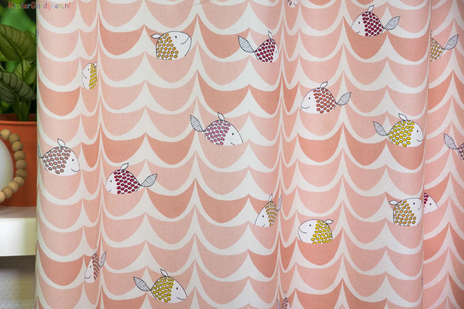 Wat een schitterende kwaliteit gordijnstof! Zien is geloven, zo mooi soepel geweven én maar liefst 280 cm breed! Dat betekent dat het babykamer gordijn meestal naadloos kan worden gemaakt. De schattige visjes print is gedrukt op een heel fijn geribde stof, wat een vlotte sportieve uitstraling geeft. De visjes in de zee zijn op de voorzijde gedrukt, 3 cm groot en leverbaar in 2 verschillende “zee” kleuren. Eigentijds vergrijsd blauw en warm perzik roze. Door het rustig herhalende patroon kan je dit gordijn uitstekend tot de grond laten confectioneren. Wanneer je extra verduistering wenst, graag optie voeren aanvinken in het bestelproces. Kortom, deze fraaie stofserie is een aanwinst binnen onze enorme collectie!