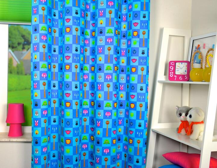 Wat een vrolijke dieren kijken naar jou! Het lijkt bijna alsof zij willen zeggen: Welkom op je slaapkamer. De beestjes zijn gedrukt in de vierkanten van 6 x 6 cm. De turquoise kleur kan zowel voor de meisjes- als jongenskamer. Ook leverbaar in drie andere vrolijke kleuren, allemaal even sprankelend en lief. Ook leverbaar als vouwgordijn. Voor extra functionaliteit zoals isolatie en verduistering, kun je tijdens het bestelproces kiezen voor de optie "Voering". De voering zorgt ervoor dat je kamer in de wintermaanden lekker warm blijft en in de zomer juist koel. Bovendien dempt de voering geluid en beschermt het gordijn tegen verkleuring door zonlicht.