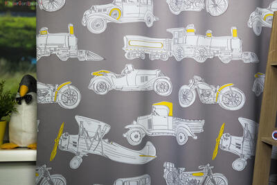 Met zijn levendige en kleurrijke ontwerp brengt dit gordijn klassieke auto's, motoren, vliegtuigen, vrachtwagens en stoomlocomotieven tot leven. Je kind zal betoverd worden door de gedetailleerde afbeeldingen van deze nostalgische voertuigen die het gordijn versieren.