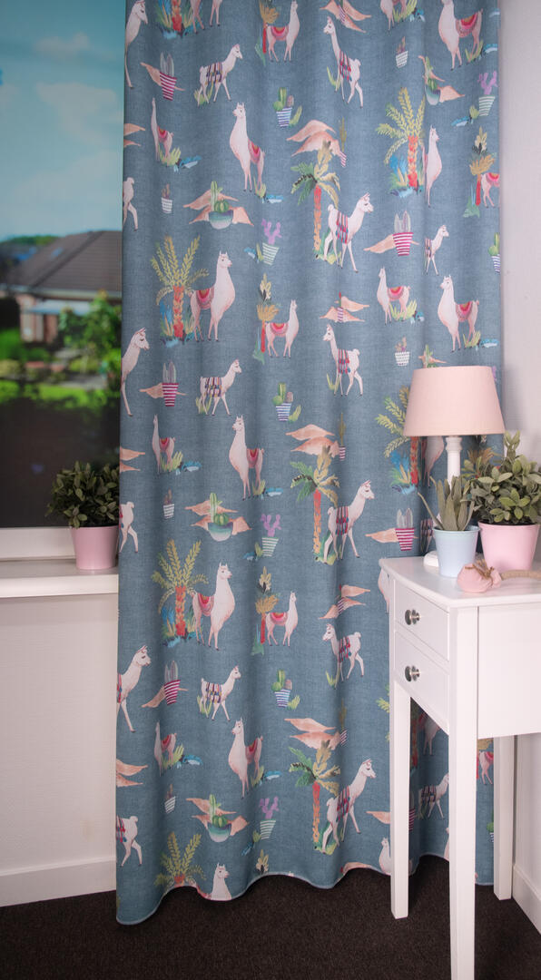 Het kindergordijn Lama is een speelse en opvallende keuze voor de kinderkamer. Op de stof zijn schattige lama's afgebeeld, die kleurrijk versierd zijn met kleden die doen denken aan de prachtige weefkunsten uit het verre oosten. Het kindergordijn Lama is verkrijgbaar in drie kleurstellingen: roze, blauw en lichtgroen. Deze kleuren zijn vrolijk en passen goed bij een kinderkamer. Je kunt de gordijnstof perfect afstemmen op de rest van de inrichting en een speelse en levendige sfeer creëren.