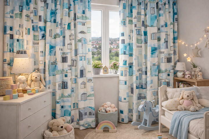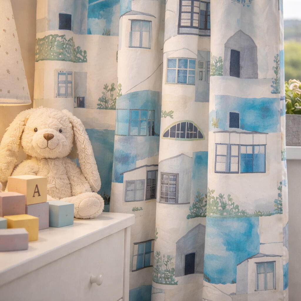 Dit kindergordijn brengt het stedelijke aanzicht van een charmante Zuid-Europese stad tot leven, waardoor een speels en avontuurlijk gevoel ontstaat in de kinderkamer. Laat de kinderen wegdromen terwijl ze omringd worden door de magie en het karakter van deze prachtige stijl.