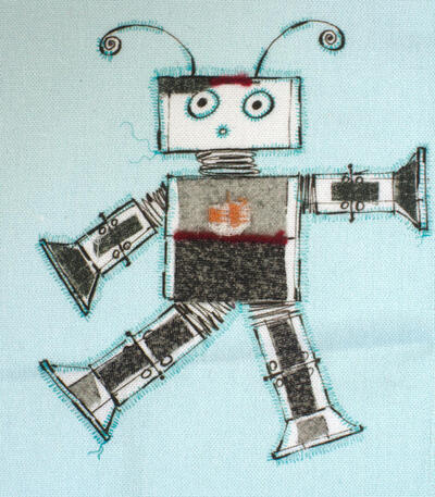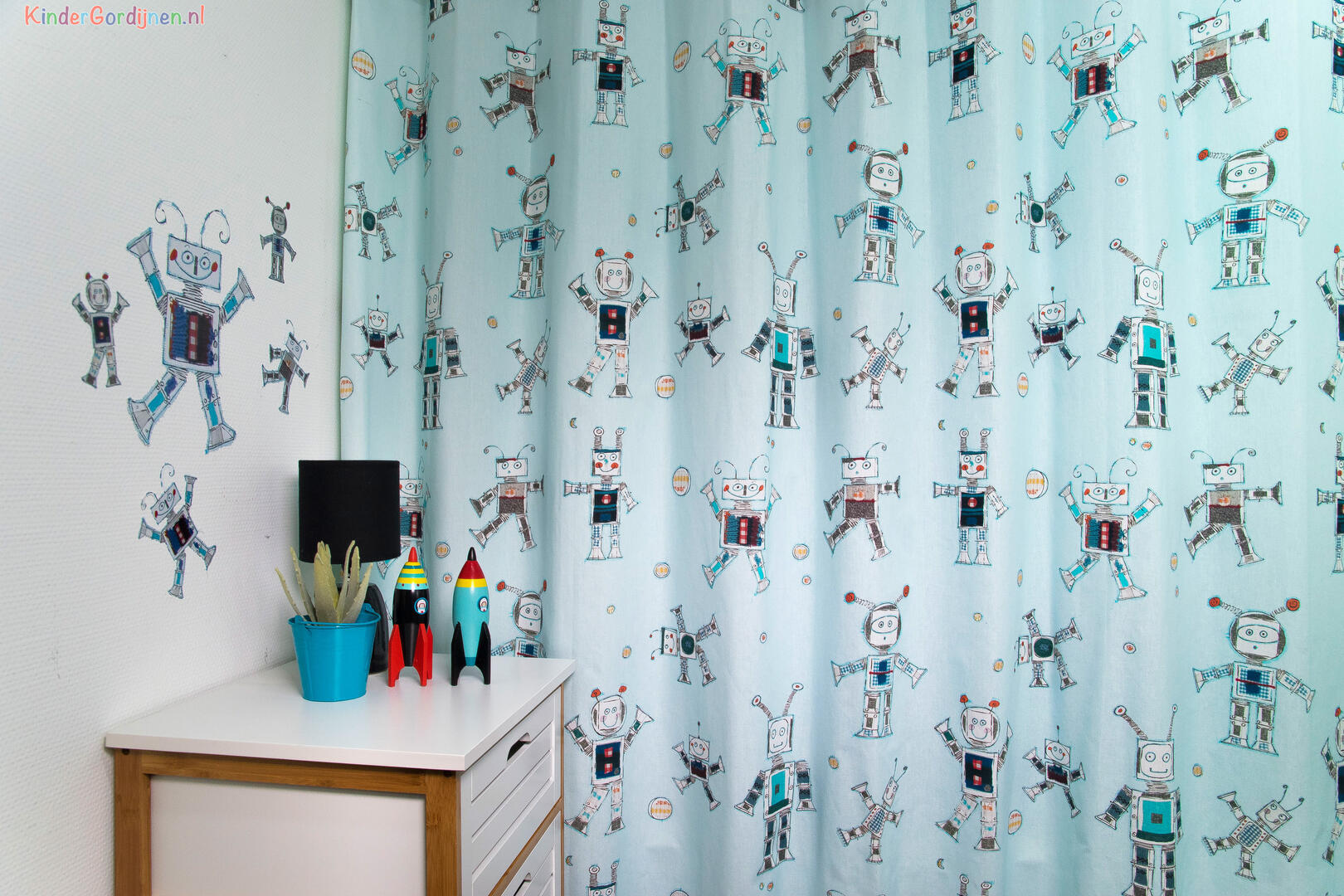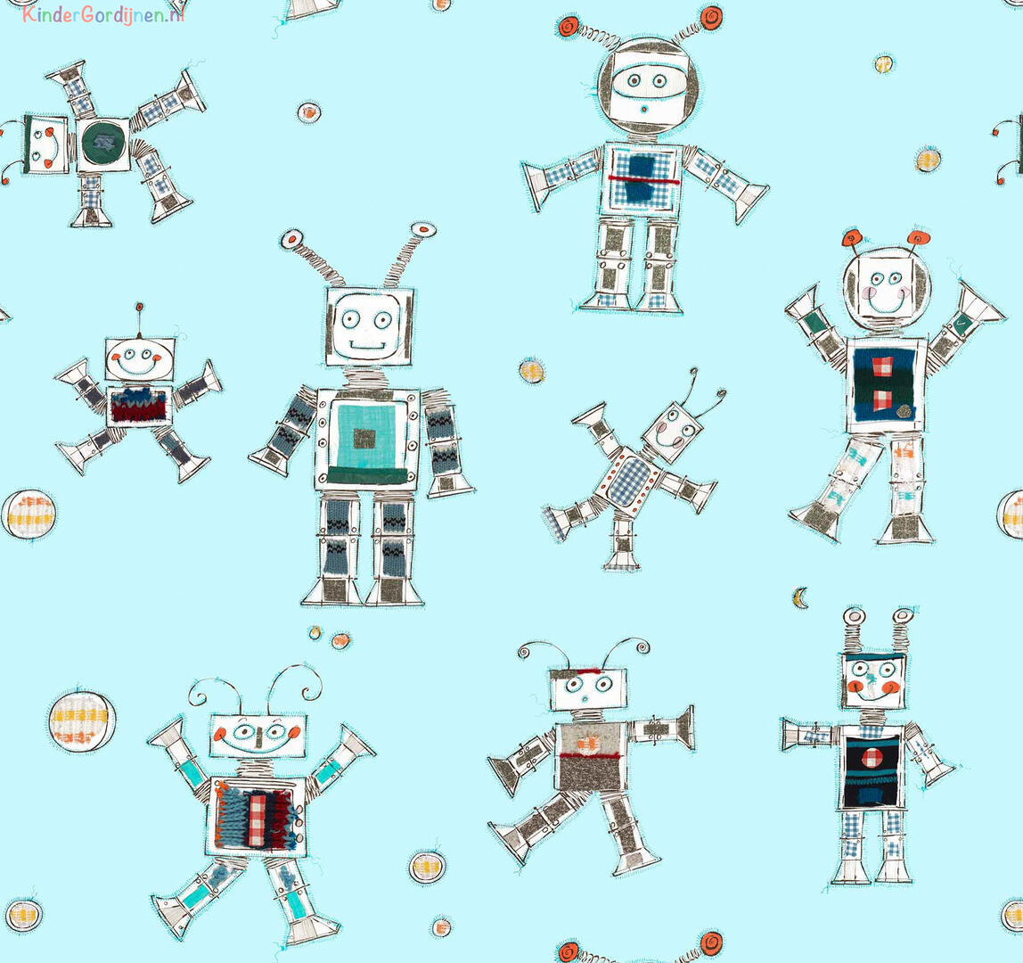 Bliep bliep! Vriendelijke handgetekende robots dansen over dit gordijn. Het ontwerp van dit gordijn is gemaakt door Hanneke de Jager. Voor verduistering even laten voeren.